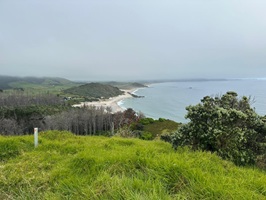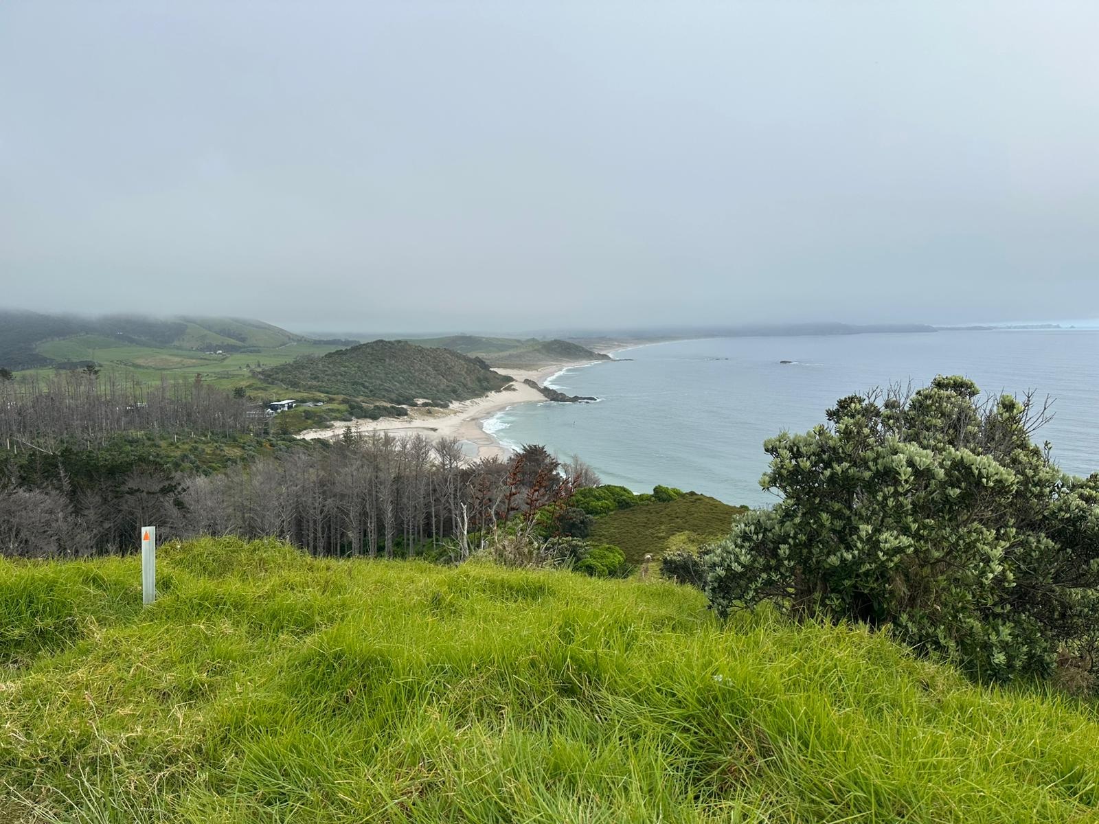 Schon bald befand ich mich auf dem Mangawhai Cliffs Walk, einem Küstenpfad, der mir immer wieder Blicke auf das Meer freigab, wenn die Bäume es zuließen. Der Nebel hatte sich noch nicht komplett verzogen, und die Sonne musste sich erst durchkämpfen.
