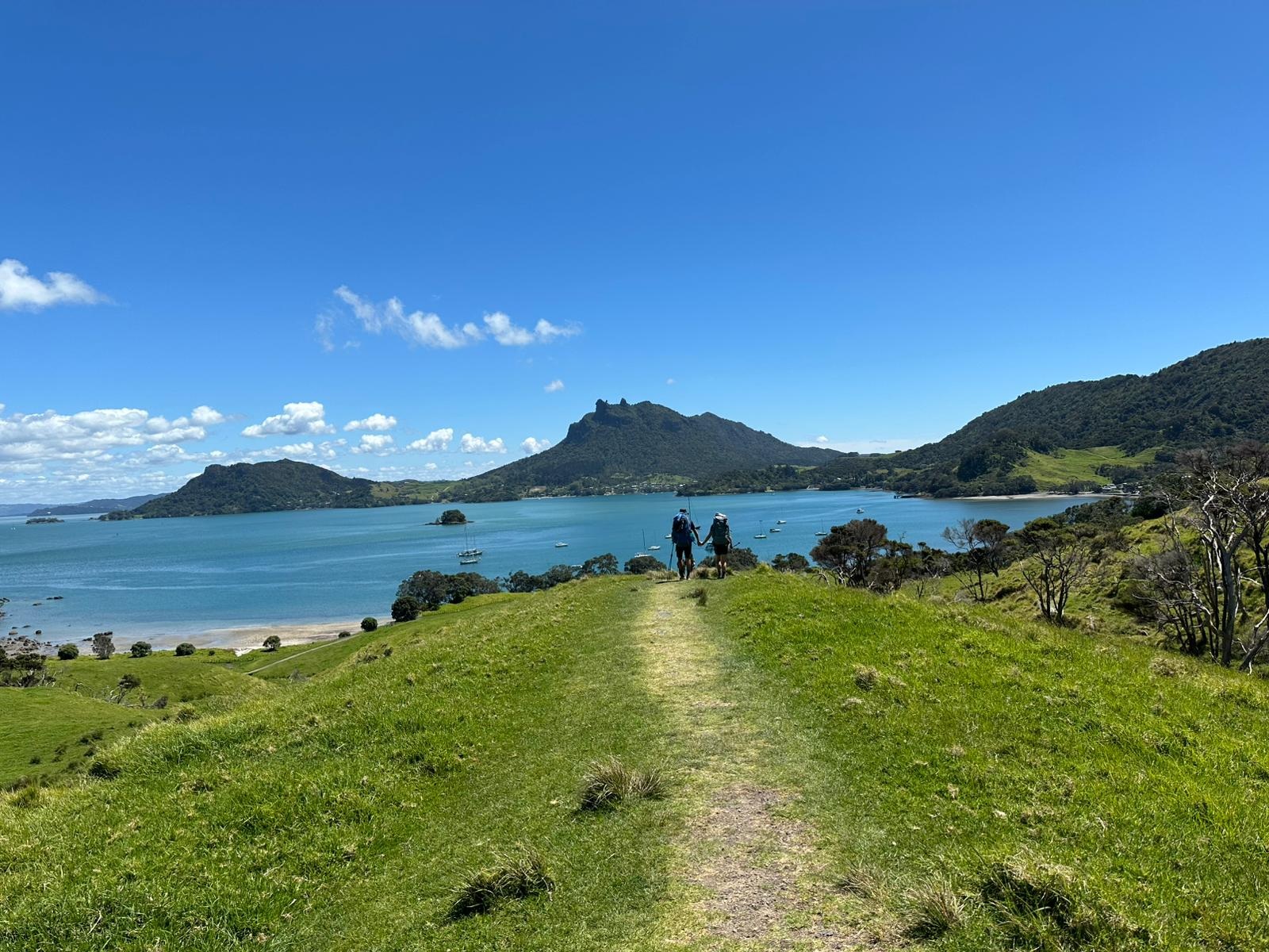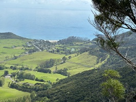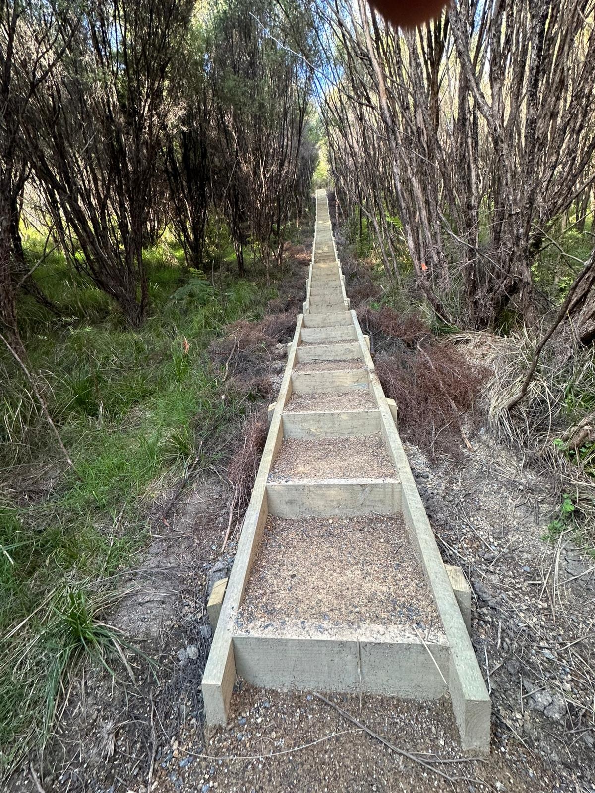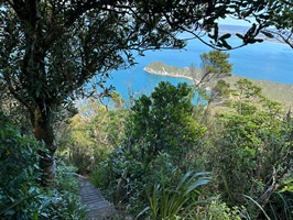 Dann ging es auf den Helena Ridge Track. Zuerst schlängelte sich der schmale Pfad durch den Wald, über all die Wurzeln, die den Weg so uneben machen. Und dann begannen die Stufen. Unzählige angelegte Stufen führten steil hinauf – Schutz der Landschaft vor Erosion und Hilfe für die Wanderer im ansonsten rutschig-gefährlichen Steilgelände. Immerhin gab es zwischendurch immer wieder einen tollen Ausblick auf das Meer. Der Pfad, von Gras gesäumt, und die Stufen wollten nicht aufhören. Es fühlte sich an, als würde es endlos bergauf gehen.