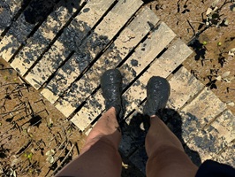 Der Kampf durch die Mangroven war eine eigene Herausforderung. Obenauf ist der Schlamm gräulich-bräunlich, aber sobald man hineintrat, wurde er tiefschwarz – und Fäulnisgeruch machte sich breit. Als wir auf der anderen Seite ankamen, erwartete uns Ken, der Neuseeländer, mit Süßigkeiten. Ein willkommener Zuckerschub für den steilen Anstieg, der uns bevorstand! Meine Schuhe waren schwarze Klumpen an meinen Füßen, unglaublich schwer, als wir die Wiese hinaufstapften. Beim steilen Anstieg waren sie noch schwerer, ganz zu schweigen von dem Gestank!