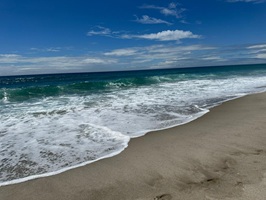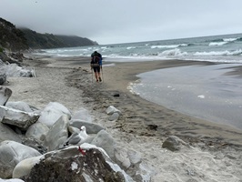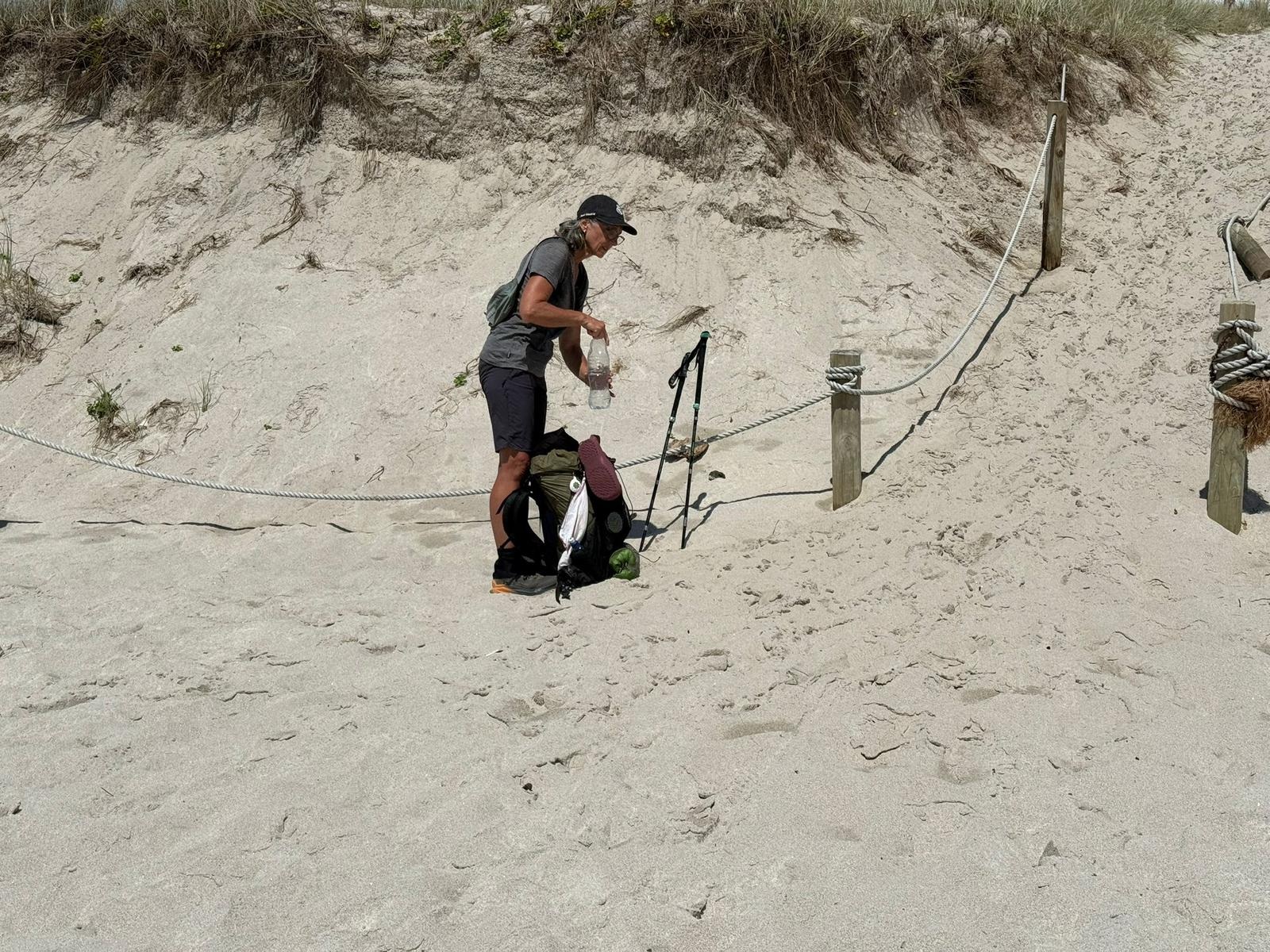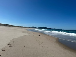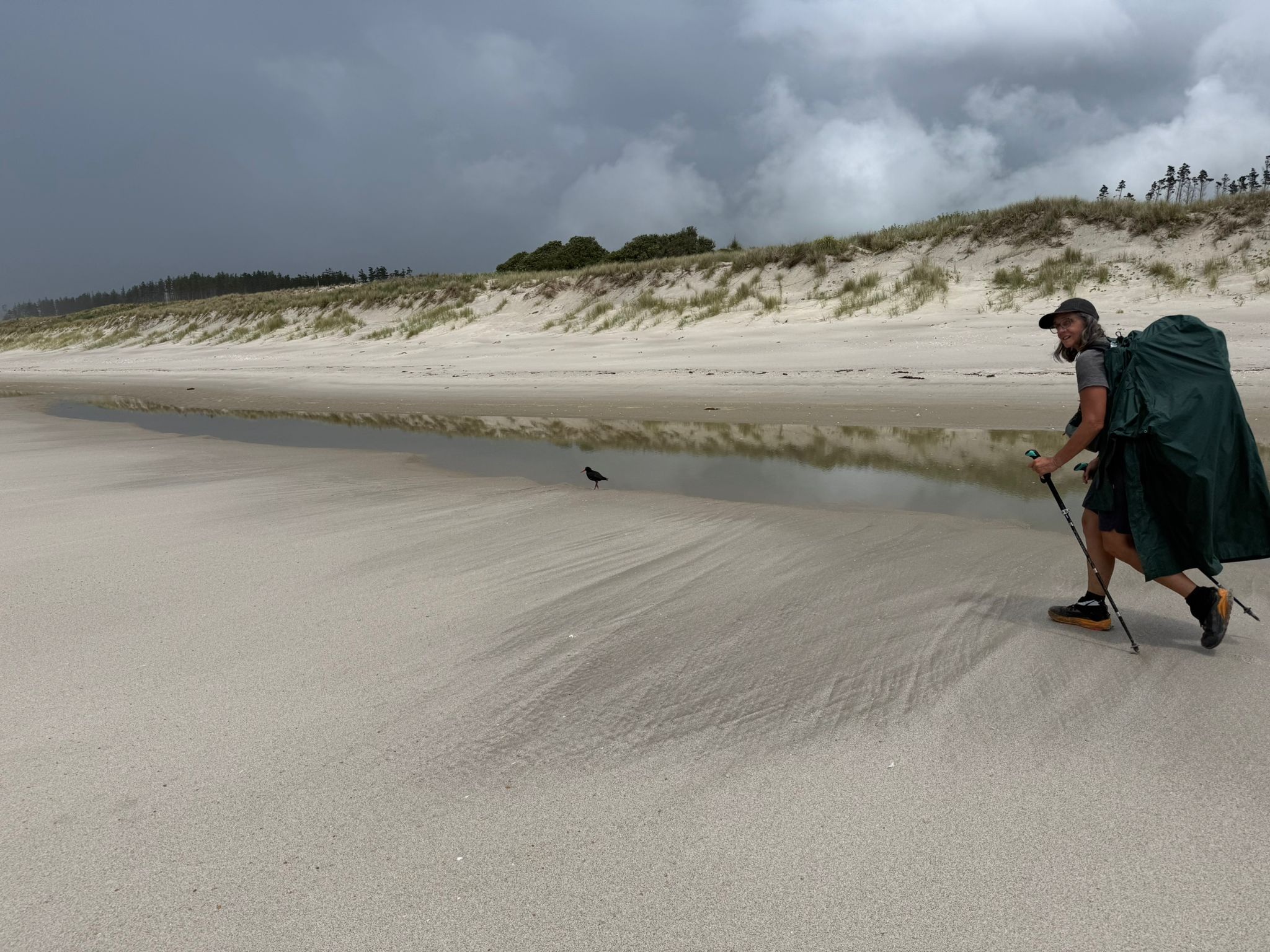 Als ich in einen Kiefernwald eintauchte, erhaschte ich schon von Weitem einen ersten Blick auf das Meer. Kurz darauf traf ich auf die anderen Wanderer unserer Gruppe, die gestern eine beachtliche Strecke von 36 Kilometern zurückgelegt hatten, um wieder aufzuschließen. Schwupps, und schon standen wir wieder am Strand, der, wie so oft auf diesem Trail, einfach einmalig war. Das Wasser reichte noch ziemlich hoch und meine Füße wurden schnell nass – aber das war ich ja inzwischen gewohnt und es machte mir absolut nichts mehr aus. Ein schöner Anblick waren die Seevögel, die sich auf einer Sandbank in der Sonne räkelten.