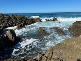 Um 10:30 Uhr machten wir uns mit den anderen auf den Weg, kamen aber nicht weit. Das Wasser war immer noch zu hoch. Wir mussten warten. Zum Glück zog uns der Besitzer des angrenzenden Grundstücks eine der Sitzgelegenheit in den Schatten und so wurde es ein angenehmer Vormittag. Ich habe mich etwas abseits auf die Felsen gesetzt und einfach das Wasser, die Sonne und die Stille genossen.