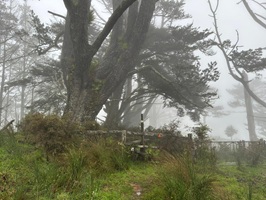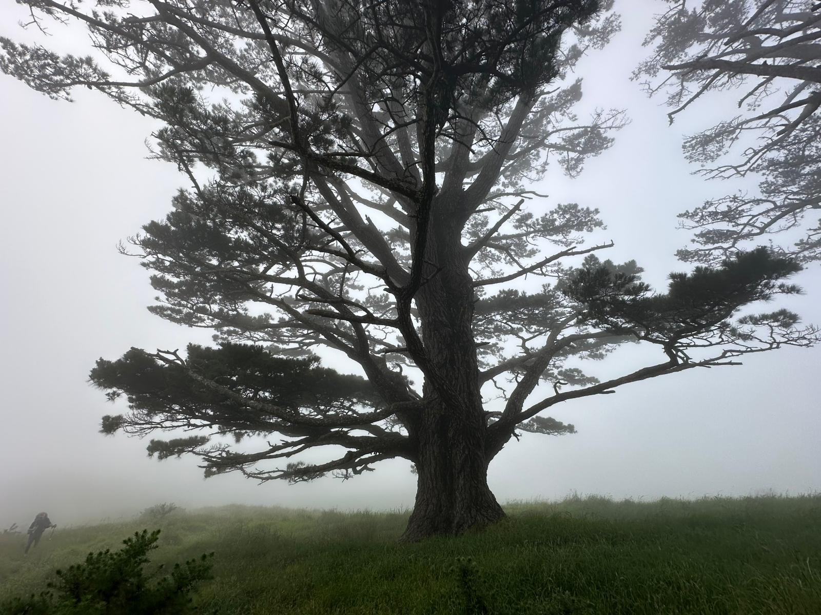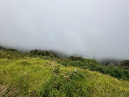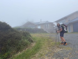 Das Schild für das letzte Stück wies auf 2,5 Kilometer und 45 bis 60 Minuten Gehzeit hin! Oh Mann, diese letzte Etappe hatte es wirklich in sich! Ich lief direkt in den Nebel hinein, der immer dichter wurde, je höher ich stieg. Ich dachte, es käme kein Ende mehr. Nur das Meer sah ich als schmalen blauen Streifen in der Ferne. Schweißgebadet erreichte ich endlich den höchsten Punkt und war froh, an der Campsite anzukommen – wieso muß die auch so hoch oben liegen?!