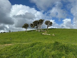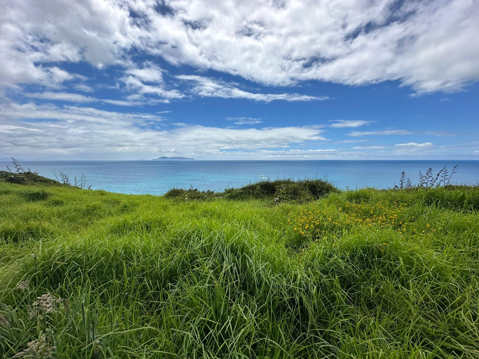 Der Abschnitt auf der Straße war zwar lang (auf der Nordinsel gibt es zahlreiche Strassenabschnitte, weil viele Landbesitzer einen Wegverlauf über ihren Grund nicht erlauben), wurde aber durch das plötzliche Herauskommen der Sonne und wiederkehrende Ausblicke aufs Meer verschönert. Unterwegs sorgte eine Begegnung der besonderen Art für Abwechslung: eine spontane Wettkampf-Situation mit drei Bauarbeitern, die ihre Hütchen, Schilder und Ampeln einpackten und ich sie dabei immer wieder einholte. Zeitweise war ich sogar vor ihnen, so schnell ich bin.
