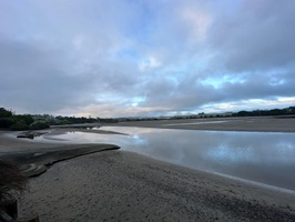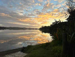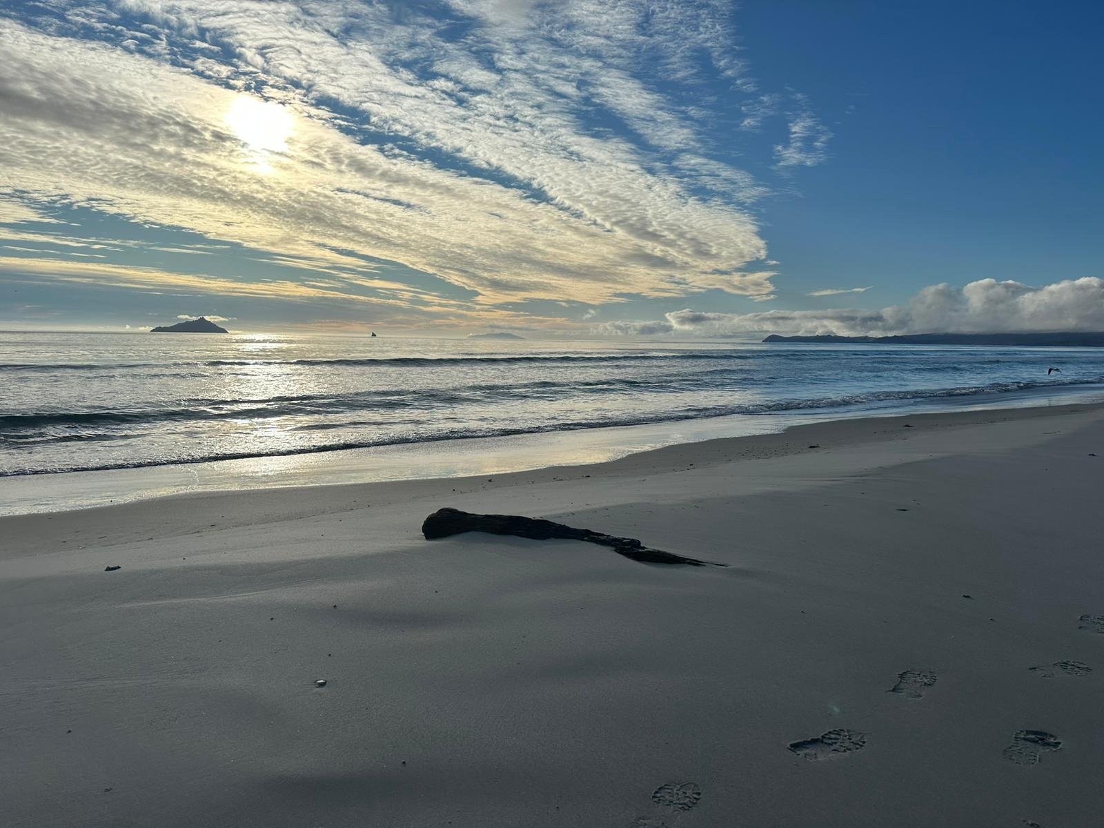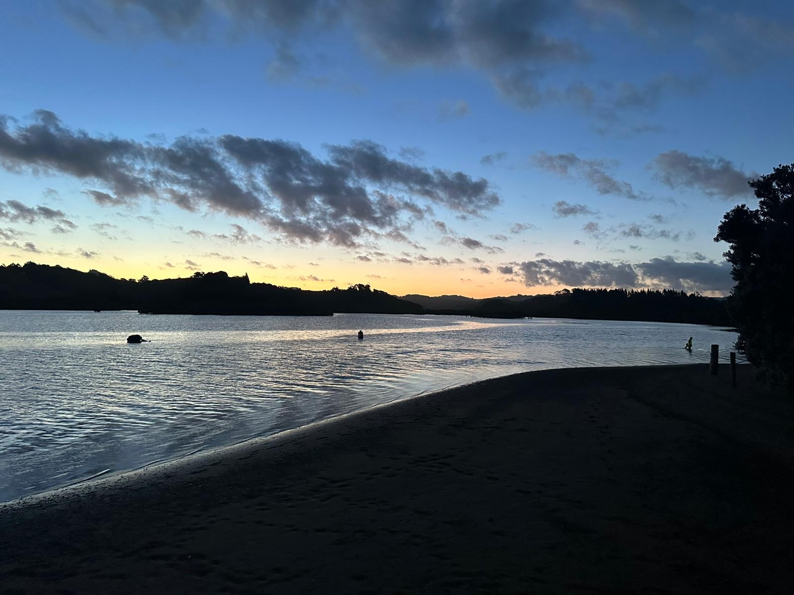Die Sonne scheint noch, und ich bin gespannt auf den Sonnenuntergang. Eben konnte ich noch die Berge auf der anderen Seite sehen, aber jetzt verschwinden sie langsam in einer langen, weißen Wolke... Aotearoa – Land der langen, weißen Wolke - halt. Es ist phänomenal, wie sich die Wolke über die Bucht schiebt.