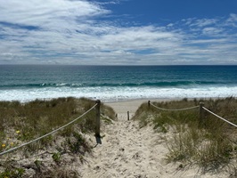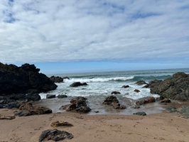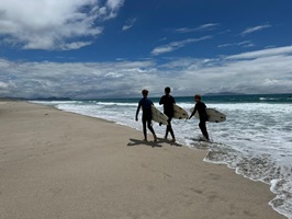 Der Strandabschnitt war wirklich traumhaft, besonders am Ende, wo eine Surfschule ihre Boards und Ausrüstung aufgebaut hatte und unzählige Surfer im Wasser waren. Nach einer kurzen Rast folgte ein steiler Aufstieg über einen kleinen, grasbewachsenen Pfad. Von oben bot sich mir ein atemberaubender Blick auf die wunderschöne Küste. Das war wirklich ein Traum.