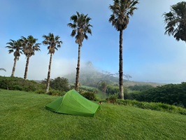 Nass geschwitzt und dem Wind ausgesetzt, war es bei der Ankunft etwas unangenehm. Wie gut, dass ich eine Regenhose dabeihatte! Aber ich war heil angekommen. Schnell hatte ich das Zelt unter einer schützenden Pergola aufgebaut, gekocht und gegessen. Das Wetter blieb ungemütlich, windig und kühl. Nach dem Essen und dem Sortieren meiner Ausrüstung war ich froh, in meinem warmen Schlafsack zu liegen.