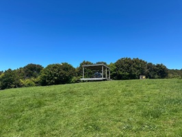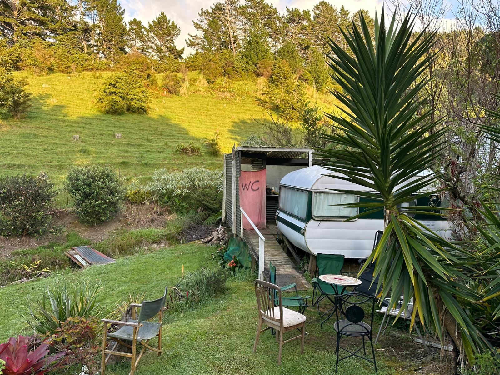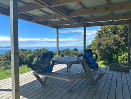 Aber die Mühe hat sich gelohnt! Schon um 14:30 Uhr waren wir im Waorahi Camp. Es ist traumhaft gelegen: eine riesige, gewölbte Wiese mit Blick auf die Küste. Es gibt sogar eine überdachte Holzterrasse mit Sitzgelegenheiten. Wasser und Toilette sind vorhanden – mehr brauche ich nicht.