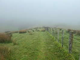 Der Tag begann, wie der gestrige endete: Alles wolkenverhangen und die fünf Hühner der Besitzerin standen erwartungsvoll vor der Küchentür. Meine Socken vom Vortag hingen noch nass vom Nebel auf der Leine. Wobei: Trockene Socken hätten heute sowieso nicht viel gebracht. Nach den ersten Metern durch knie- und hüfthohes, regennasses Gras waren Schuhe und Socken sofort nass, und bald auch die Hose. Ach ja, und neben meinem Zelt haben zwei Jungens aus Malaysia gezeltet – einer davon hat die ganze Nacht so fürchterlich geschnarcht, da wünscht man sich wirklich ein Zelt mit "Schallschutz".
