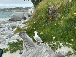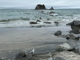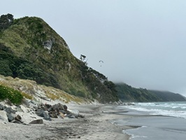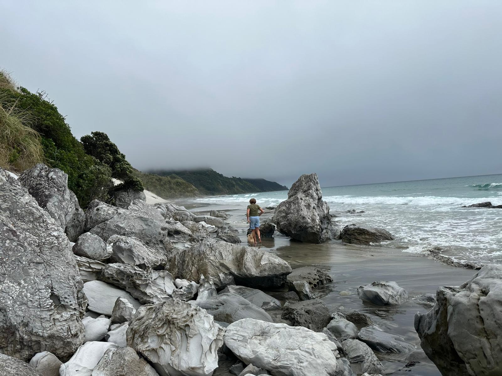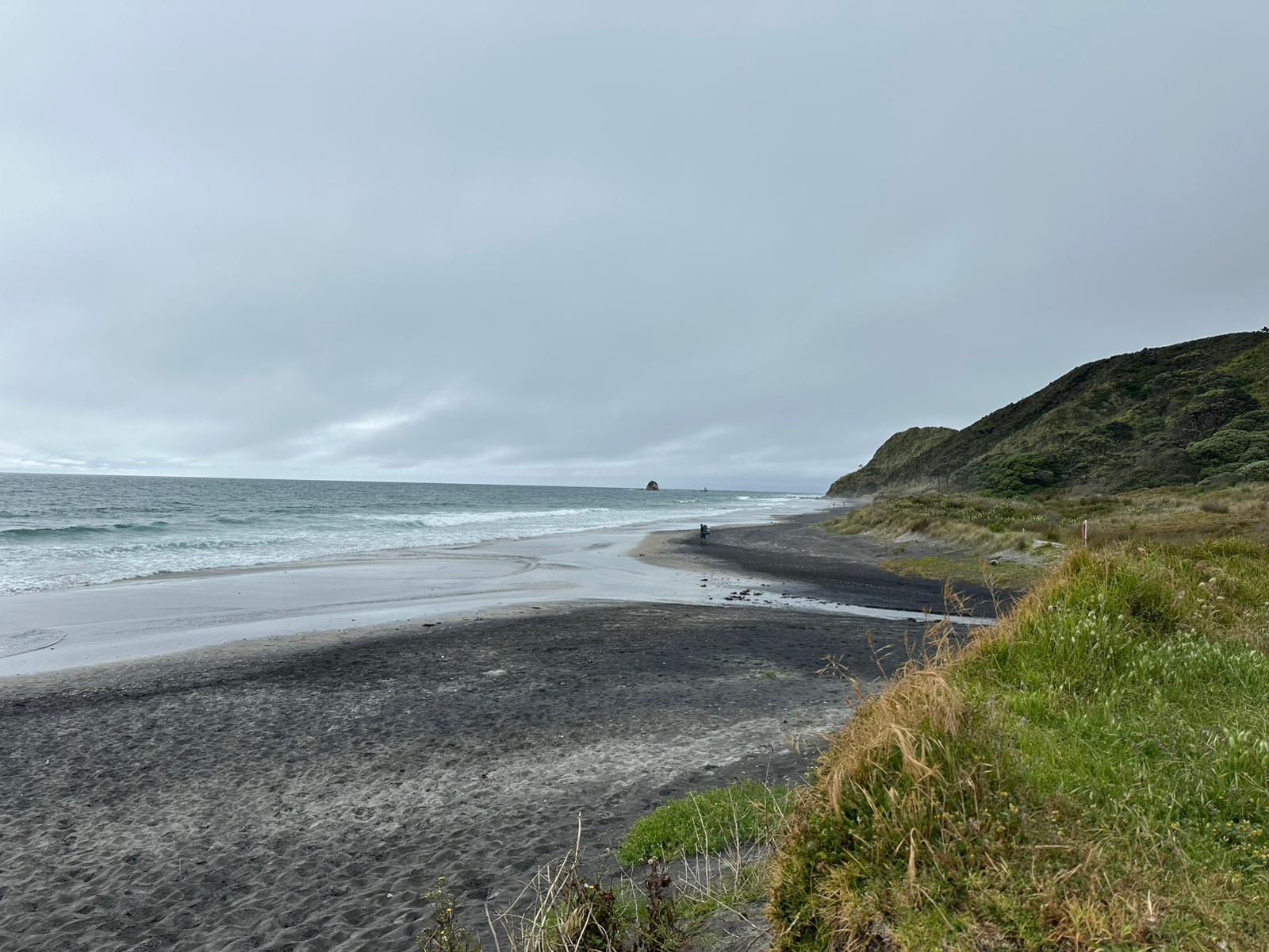 Der nächste Abschnitt führte mich dann einige Kilometer über den Strand – schwarzer Sand und Muscheln, genau das Richtige für mich. Hier ein Schwätzchen mit einem Hundebesitzer, dort mit einem Angler, und auch Anwohner traf ich reichlich. Diese vielen kleinen Unterhaltungen gehören zu meinem Alltag hier. Die Neuseeländer sind so freundlich, unglaublich sympathisch und offen, das gefällt mir sehr. Bevor ich den Strand verlassen musste, gab es noch einen kleinen Snack zu Mittag direkt am Wasser. Die Möwen sammelten sich gierig um mich, aber für sie gab es nichts ab.