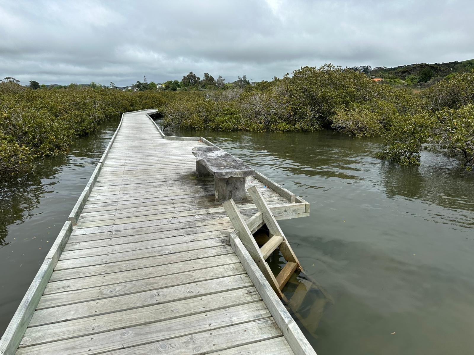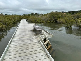 Nach der Brücke kam noch einmal ein schmaler Schotterweg, und schon war ich auf dem "Boardwalk" – einem Steg durch die Mangroven. Er wurde 2020/2021 komplett neu von Freiwilligen gebaut, nachdem ein Zyklon den alten zerstört hatte. Es ist wirklich toll, was Freiwillige alles bewirken können.