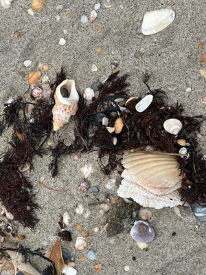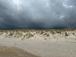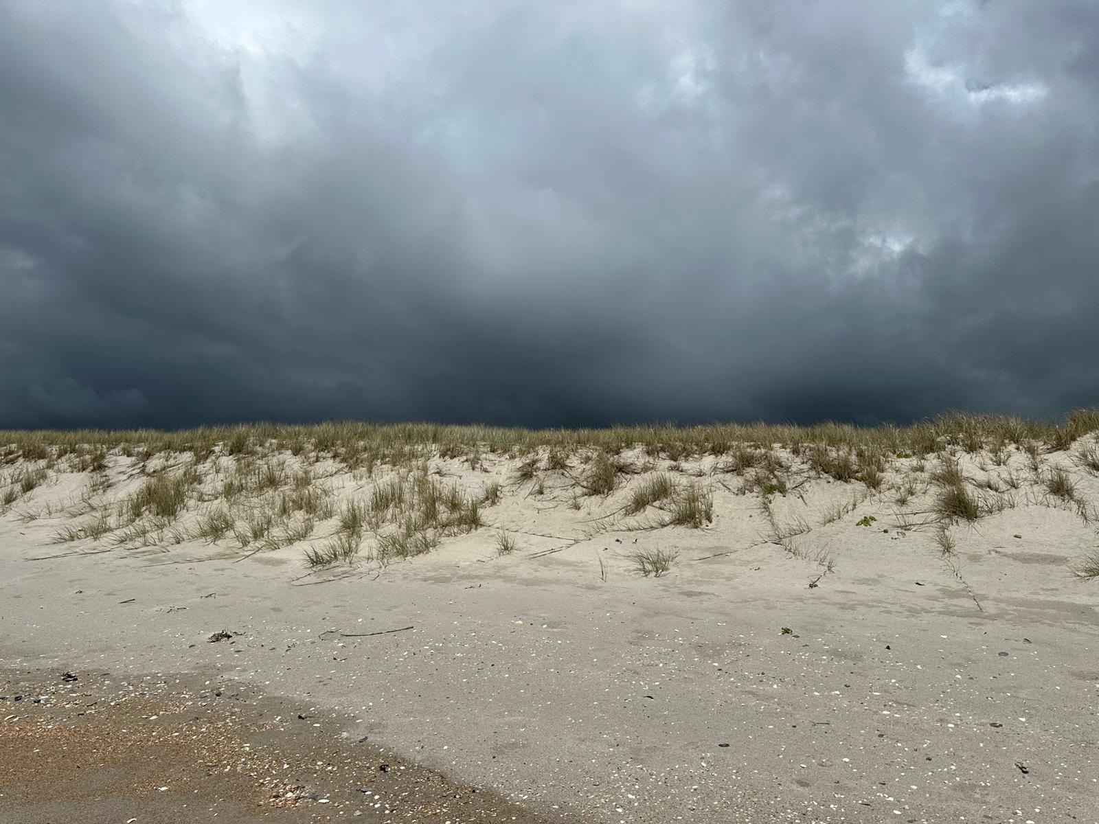 Obwohl die Flut immer noch weit in den Sand reichte, war das Laufen hier ein Traum. Überall lagen Jakobsmuscheln herum – so viele, wie ich sie noch nie zuvor gesehen hatte! Am liebsten hätte ich sie gleich säckeweise gesammelt, um mein Muschelglas zu Hause zu füllen. Es war faszinierend, die vielen Muscheln und unsere Spuren im feuchten Sand zu sehen. Der Himmel über dem Meer zeigte sich azurblau mit leichten Schleierwolken, doch der Blick nach rechts über die Dünen offenbarte dicke, graue Wolken. Ich zog es vor, nach links zu schauen und das schöne Blau zu genießen.