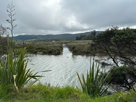 Nachdem ich den letzten Fluss für diesen Tag durchwatet hatte, lagen noch gut fünf Kilometer bis zur Campsite vor mir. Daraufhin stand ein Anstieg von knapp 400 Höhenmetern auf den letzten zwei Kilometern bevor. Lieber wollte ich heute noch etwas weiterkommen, denn ich wusste, dass auch der morgige Tag anstrengend werden würde. Um mich für die letzten Kilometer zu motivieren, gönnte ich mir an der letzten Möglichkeit ein Eis und eine neuseeländische Limo. Das "kleine Stückchen" würde ich jetzt spielend schaffen! Der eben überquerte Fluss verlief nun zu meiner Rechten, gesäumt von Mangroven. Die Berge hatten derweil schon wieder eine Wolke als Mützchen aufgesetzt.