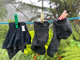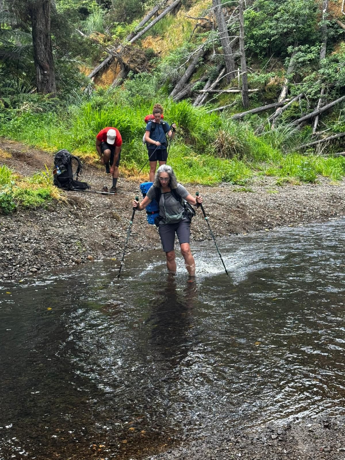 Danach ging es richtig los: Alles war rutschig, matschig, steil rauf und runter. Regina und Tino träumten schon von Lasagne, Pizza und Bier. Ich betonte zwar immer wieder, dass es nicht mehr weit sei – war es aber! Der Wald an sich war wunderschön, fast wie ein Urwald. Mystisch bei dem feuchten Wetter, das die Pflanzen, Moose und Flechten sichtlich lieben. Man sah kaum Spuren menschlichen Eingreifens. Ein kleiner Fluss schlängelte sich neben unserem immer schmaler werdenden Pfad. Als wir ihn durchqueren mussten, war es eine willkommene Gelegenheit, die total matschigen Schuhe und Socken abzuspülen.