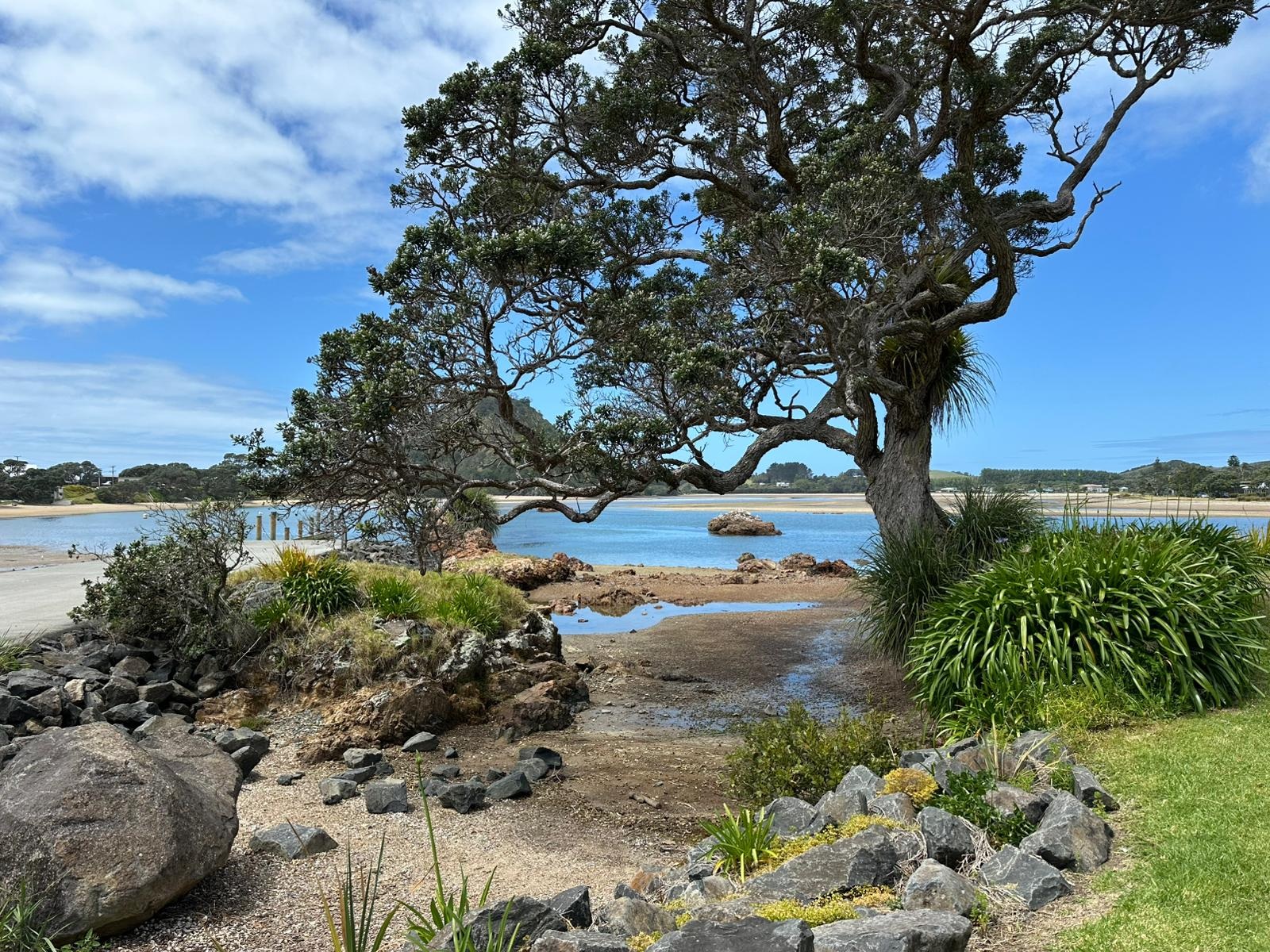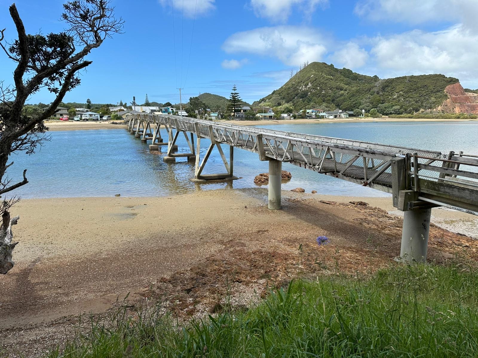 Das Städtchen Mangawhai selbst war nichts Besonderes. Ich war schnell hindurch und auf der Brücke. Mir fiel nicht sofort auf, dass Muschelbruchstücke in den Gehweg eingearbeitet waren – sehr originell.