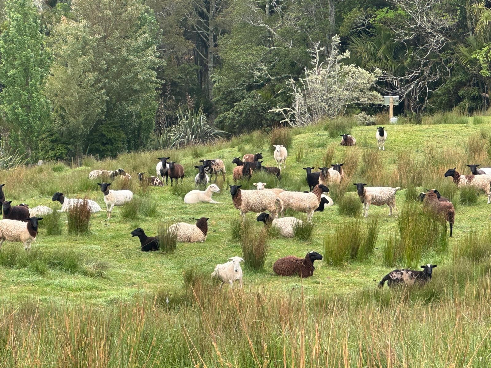 Als ich den Wald hinter mir ließ, setzte sich der Weg auf Schotter fort, bis ich privates Weideland erreichte. Wir Hiker dürfen hier passieren, obwohl das nicht alle Grundstücksbesitzer gerne sehen. Heute hatte ich Glück und konnte mir einen Umweg sparen. Die Schafe in ihren verschiedenen Farben ließen sich weder von mir noch vom einsetzenden Nieselregen stören.