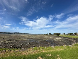 Zwei Jungs kamen gerade vom Strand, mit 10-Liter-Eimern und Hammer bewaffnet. Sie haben Austern von den Steinen geschlagen. Leider sprachen sie kein Englisch. Der Esplanade Walk führte mich schließlich bis zur Campsite, wo ich heute zelten werde. Hier in dem Reservat sind viele Watvögel unterwegs. Die Lavaströme sind jetzt, bei Ebbe, sehr gut zu sehen.