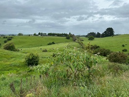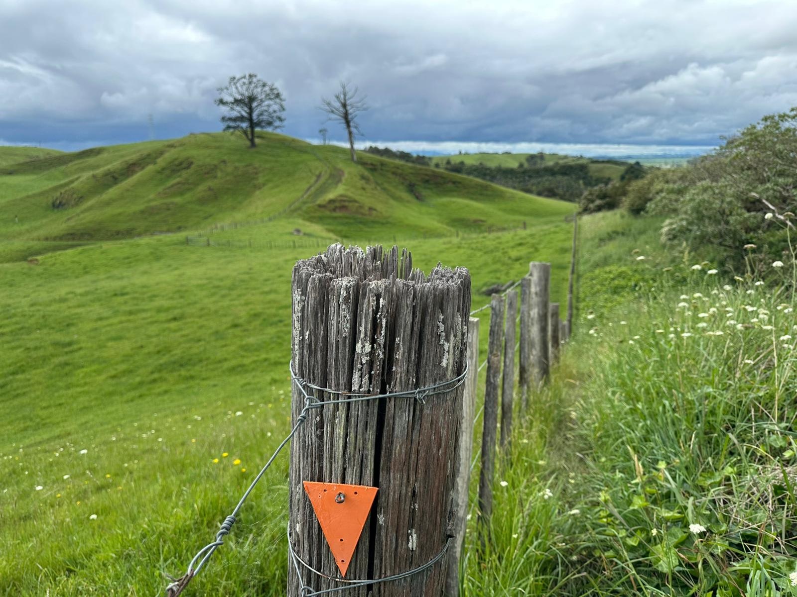 Rechts Schafweiden, links noch einmal ein Blick auf den One Tree Hill. Unten auf der Wiese habe ich gerade zum zweiten Mal heute einen Sittich gesehen und fotografiert, ein rotes Köpfchen – leider etwas unscharf. Vor lauter Sittichen bin ich die Wiese bis ganz unten gelaufen – die falsche Richtung! Aber dafür wartete Ken, der Kiwi, schon am Zaun. Auf ihn warte ich schon seit Tagen. Er ist der netteste Mensch, den ich bisher auf dem Trail getroffen habe.