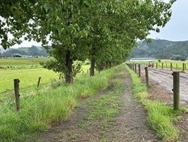 Zur „Abwechslung“ ging es über eine Kuhweide. Der Weg war allerdings eine Katastrophe: nach dem langen Dauerregen total matschig, rutschig und von den Kühen komplett zertrampelt. Die Mädels auf der Weide guckten erst blöd, entschieden dann aber, mich zu begleiten. Sie liefen neugierig neben mir her und wirkten fast enttäuscht, als der Zaun unser gemeinsames Stück beendete.