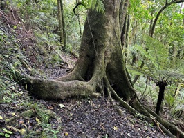 Ich kam an einem tausendjährigen Kauri vorbei, der eine Höhe von dreißig Metern hatte und einen wahnsinnigen Umfang besaß. Es ist schade, dass ich seine schiere Größe auf einem Foto nicht wirklich festhalten konnte – für den richtigen Eindruck man muß vor so einem Riesen leibhaftig davor stehen.