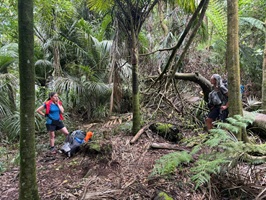 Der Abschnitt war sehr fordernd. Ich musste hochkonzentriert über Wurzeln und Matsch klettern. Äste stachen in meine Arme und Beine, und scharfes Gras kratzte mir die Haut auf. Glücklicherweise erreichte ich oben eine Lichtung und machte dort meine Mittagspause.