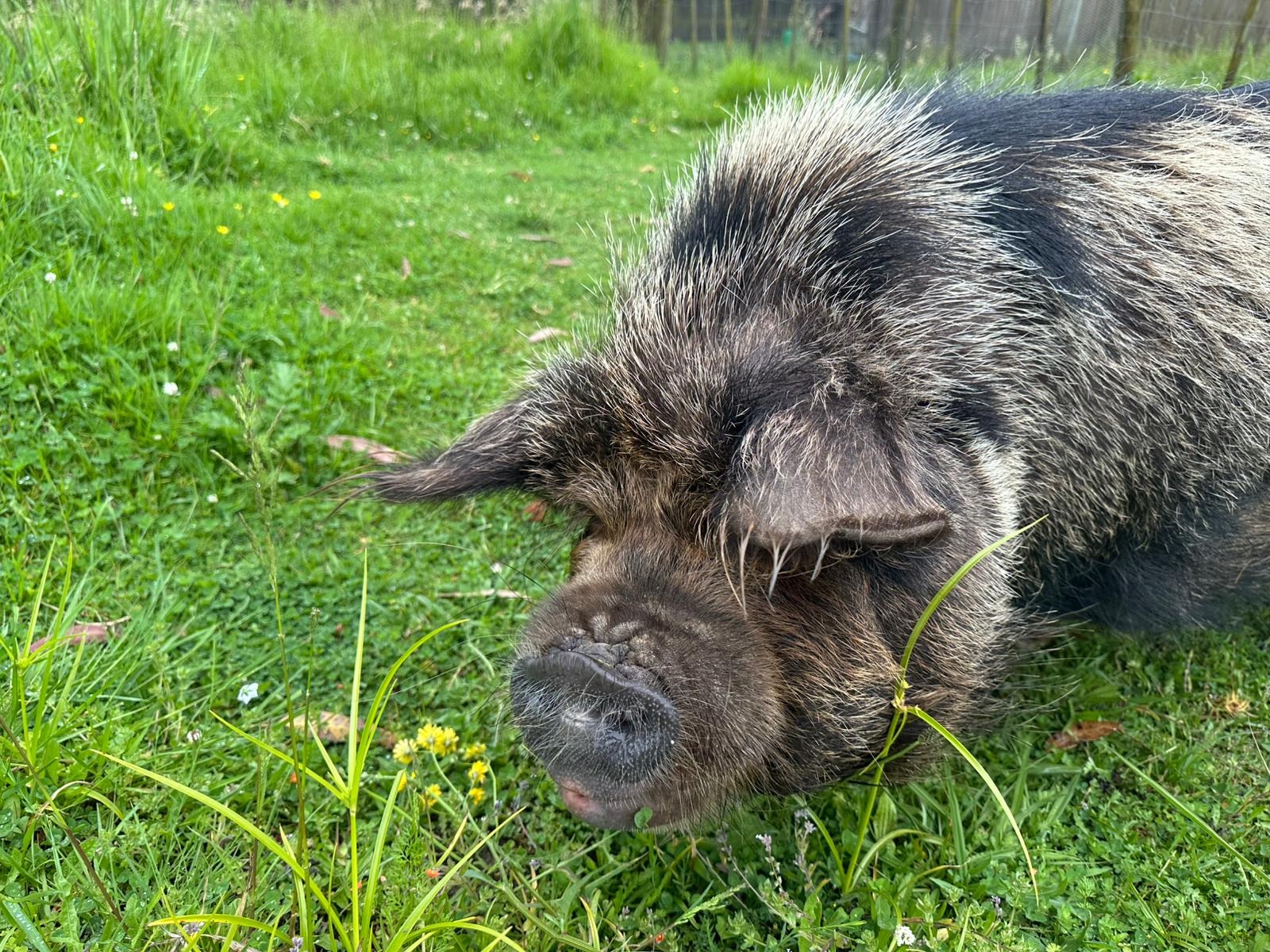 Ein kleines Highlight war die Begegnung mit einem Kunikuni-Schwein (die Rasse kannte ich sogar aus dem Tiergarten in Mönchengladbach!). Es wirkte fast blind, ließ sich beim Fressen nicht stören, kam dann aber doch zum Zaun. Ich schickte es zurück auf die Weide und zog weiter.