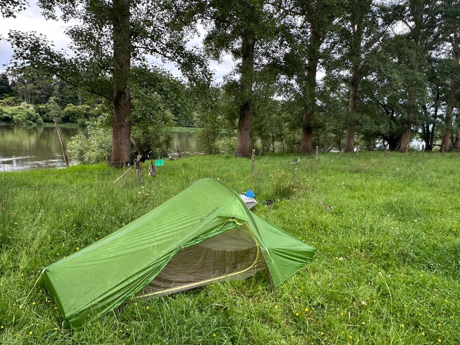 Die Nacht war ruhig, abgesehen von den Geräuschen des Flusses und der Natur, aber lange Schlafen gelingt mir selten. Darum hatte ich schon um 6:30 Uhr wieder fertig gepackt und startete den Weiterweg. Der Start war allerdings nicht gerade gemütlich. Schon die ersten zehn Meter durch das vom nächtlichen Regen nasse Gras machten klar: meine Socken werden pitschnass – noch nasser als sie ohnehin schon waren. Ein Gefühl, das mich heute noch eine Weile begleiten sollte, denn durch das hohe, feuchte Gras wurde auch die Hose schnell bis zur Hüfte durchnässt. Konzentration war beim Laufen das A und O, da sich Wurzeln und Äste gerne unter dem Bewuchs versteckten und ordentliche Matschpassagen gab es natürlich auch wieder.