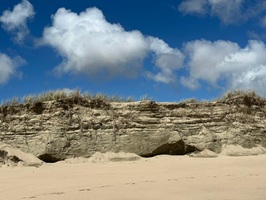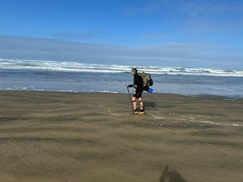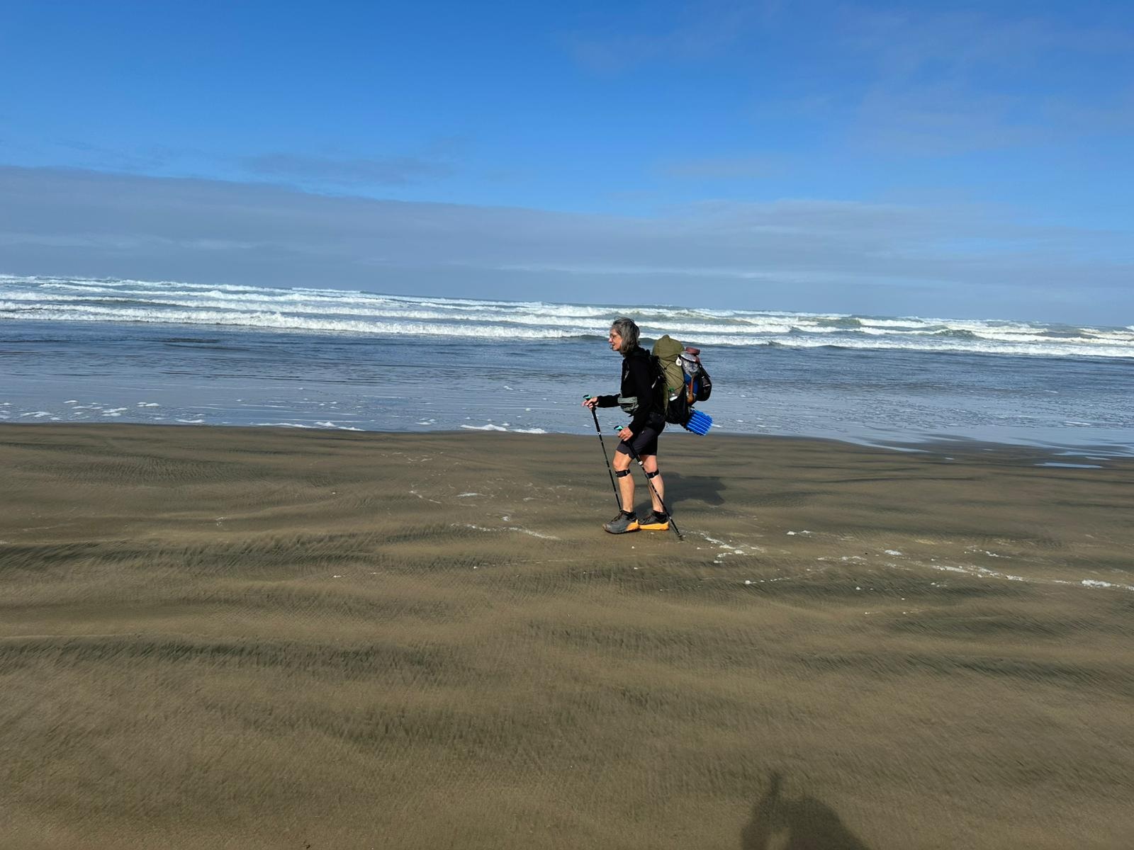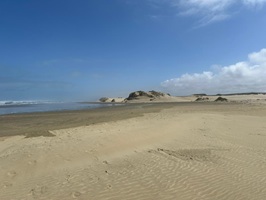 Der Tag begann bedeckt, später setzte sich die Sonne durch. Die Landschaft war wenig abwechslungsreich, und der Sand wechselte ständig zwischen hart und weich, was die Strecke konstant anstrengend machte. Ich bin bisher glücklicherweise blasenfrei, obwohl viele andere Wanderer nicht so viel Glück haben. Heute musste sich sogar jemand mit Achillessehnenproblemen vom Strand abholen lassen.