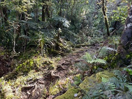Nach der dritten Pause erreichten wir den Mangamuka Saddle. Von hier aus stand uns noch ein letztes großes Auf und Ab bevor: einmal runter und dann der letzte große Peak für heute, bevor es nur noch bergab gehen sollte. Wir waren extrem dankbar, dass das DOC (Department of Conservation) den Wald im wahrsten Sinne des Wortes "aufgeräumt" hatte. Größere umgestürzte Bäume waren beseitigt und das Unterholz war geschnitten. Ohne diese Arbeit wäre der Weg um ein Vielfaches anstrengender gewesen.