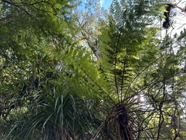 Es folgten Abschnitte auf der Straße, durch Kiefernwälder mit weichem, duftendem Boden, sanften Sonnenstrahlen zwischen den Bäumen und durch verwunschenen Farnwald, der mit riesigen Farnen und Palmen eine märchenhafte Kulisse bot. Weideland und Wald wechselten sich regelmäßig ab.