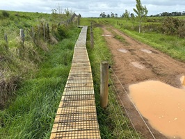 Beim ersten Stopp trafen alle aus dem gestrigen Camp aufeinander: Es wurde hin und her überlegt: River Crossing oder Bypass? Angesichts des angekündigten Regens und der damit verbundenen Gefahr, entschied ich mich zunächst für den Bypass. Bei einer kleinen Pause habe ich das klatschnasse Zelt an einen Zaun gehängt. Der Wind hat es aufgebläht wie ein Segel und getrocknet. Mein Rucksack war danach merklich leichter. Wir haben noch einmal überlegt und gehen jetzt doch nicht in Bypass und machen die River Crossing. Während ich auf dem Weg den Geruch von Wildschweine wahrnahm, erinnerte ich mich an den Vorfall mit dem angegriffenen Zelt einer Wanderin am Strand. . Das Schwein hat die Zeltwand beschädigt und ihre Matte zerstört.