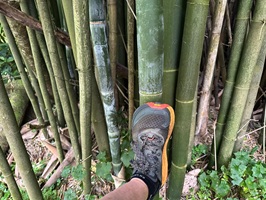 Trotzdem war ich froh, als ich auf eine Gravel Road abbog, die mich weg vom Asphalt führte. Die Landschaft wandelte sich in sanftes Weideland, bevölkert von Rindern und sogar Truthähnen mit ihren Küken. Ein besonders beeindruckendes Bild bot sich mir, als ich an einer schier endlos langen und wahnsinnig hohen Bambushecke vorbeilief. Die Sonne strahlte, ein leichter Wind wehte – perfekt für eine kleine Pause, die ich mir gönnte.