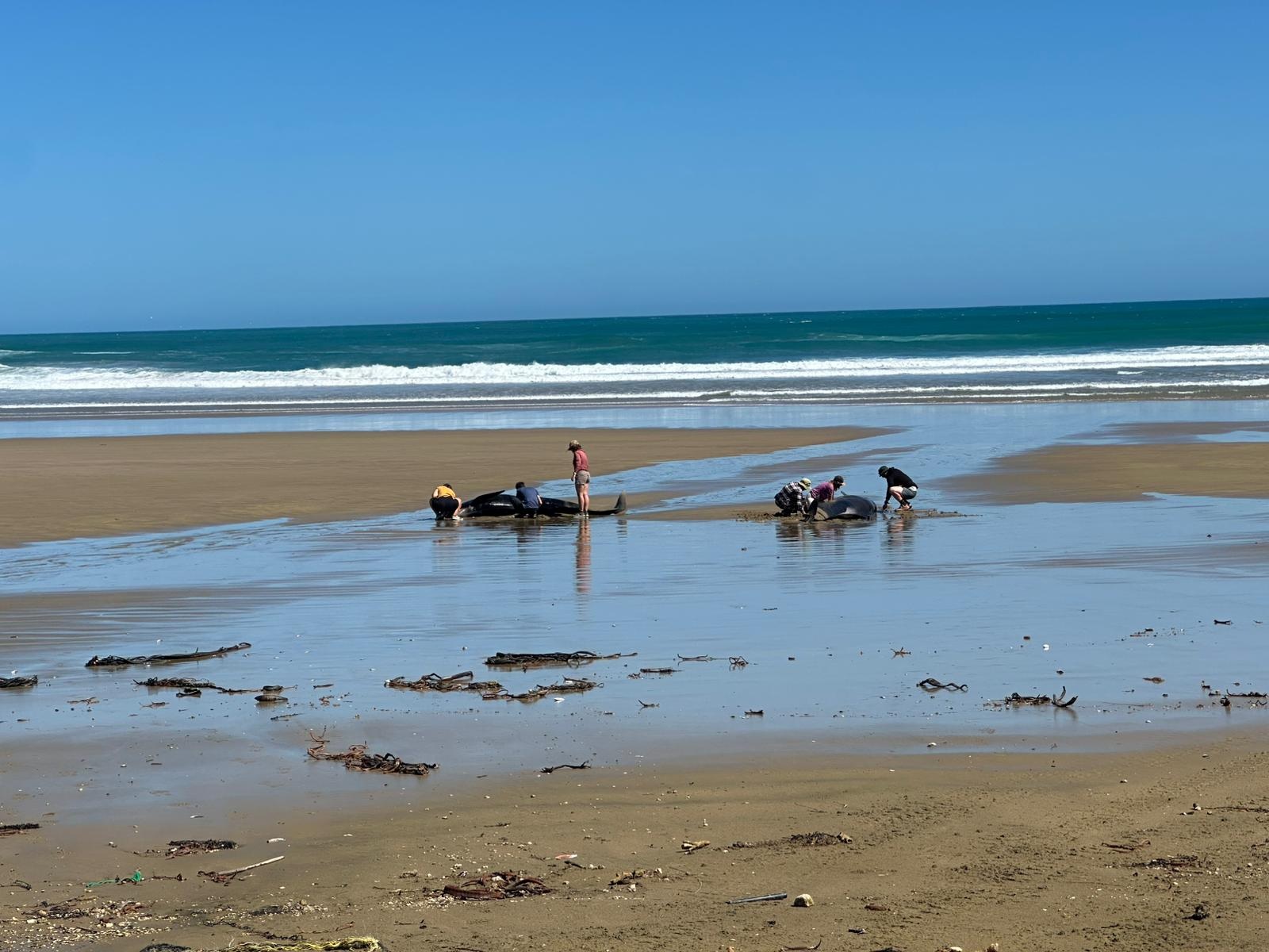 Es war furchtbar, die sterbenden Wale auf dem Weg zum Camp zu sehen – super traurig. Blöd war, dass wir kaum Empfang hatten. Über die TA WhatsApp Gruppe baten wir um Hilfe, und schließlich kam das DOC (Department of Conversation) mit zwei Wagen. Vielleicht kommt später noch mehr Hilfe, inzwischen ist auf jeden Fall Hochwasser.