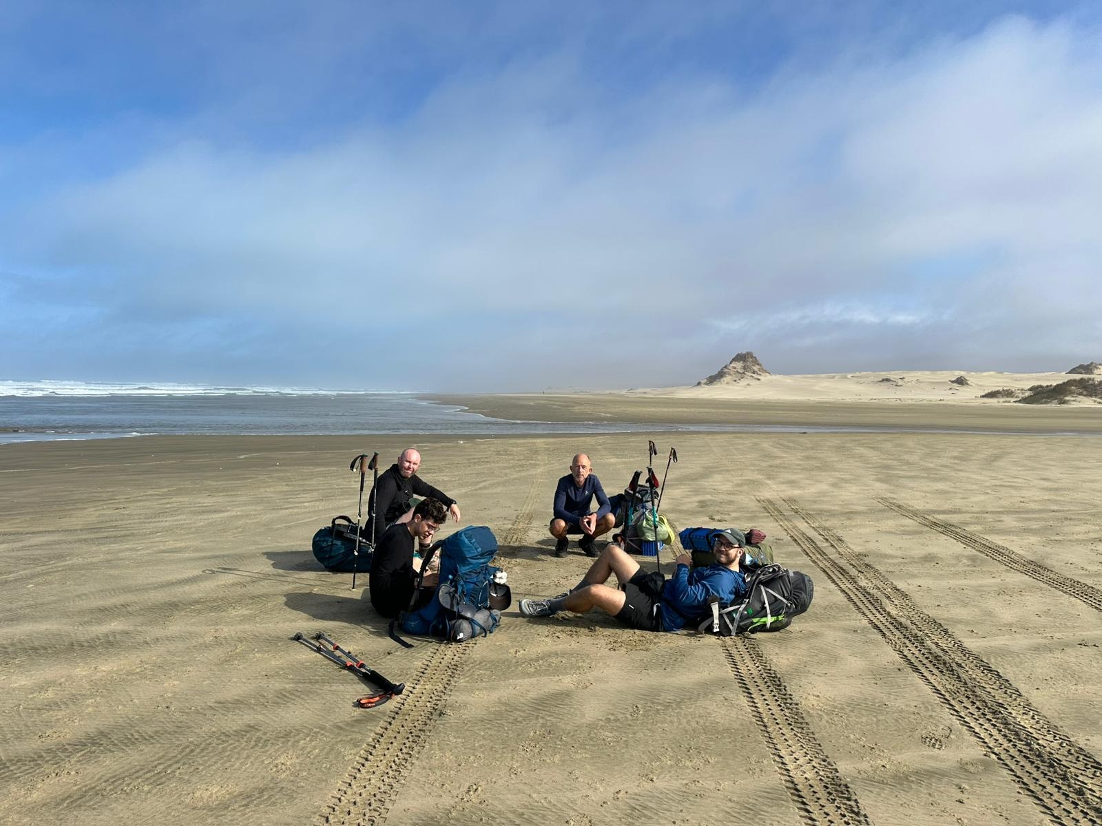 Als ich in einen Kiefernwald eintauchte, erhaschte ich schon von Weitem einen ersten Blick auf das Meer. Kurz darauf traf ich auf die anderen Wanderer unserer Gruppe, die gestern eine beachtliche Strecke von 36 Kilometern zurückgelegt hatten, um wieder aufzuschließen. Schwupps, und schon standen wir wieder am Strand, der, wie so oft auf diesem Trail, einfach einmalig war. Das Wasser reichte noch ziemlich hoch und meine Füße wurden schnell nass – aber das war ich ja inzwischen gewohnt und es machte mir absolut nichts mehr aus. Ein schöner Anblick waren die Seevögel, die sich auf einer Sandbank in der Sonne räkelten.