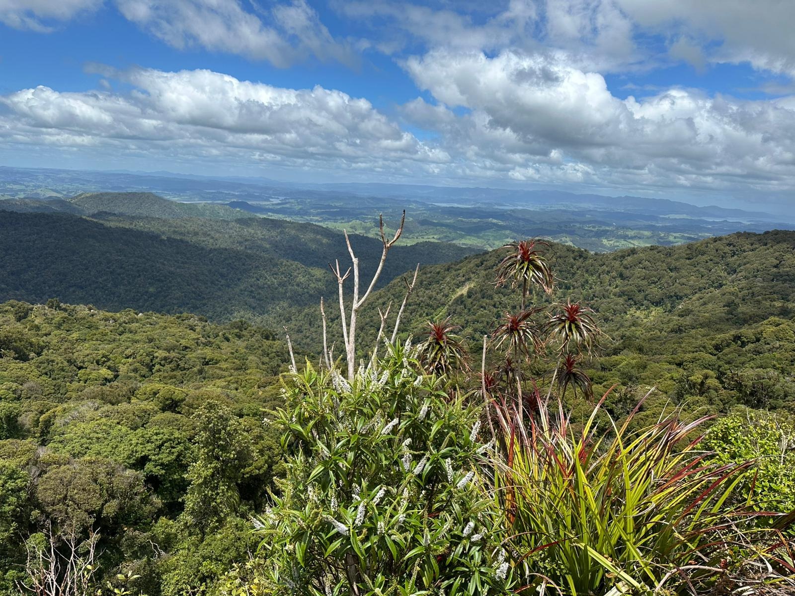 Um 7:30 Uhr ging es nahe des Pakiri Beach los. Wir hatten etwa zehn Stunden veranschlagt und die haben wir auch gebraucht. Allein für das erste Waldstück brauchten wir drei Stunden, es war ein ständiges Rauf und Runter. Wir machten eine kurze Pause an einem Hubschrauberlandeplatz und hatten sogar ein paar flüchtige Ausblicke auf die Küste. Die Wolken waren aber so schnell, dass man das Panorama wirklich nur kurz genießen konnte.