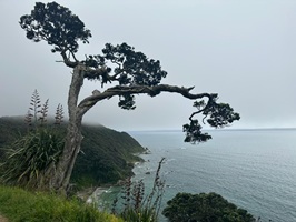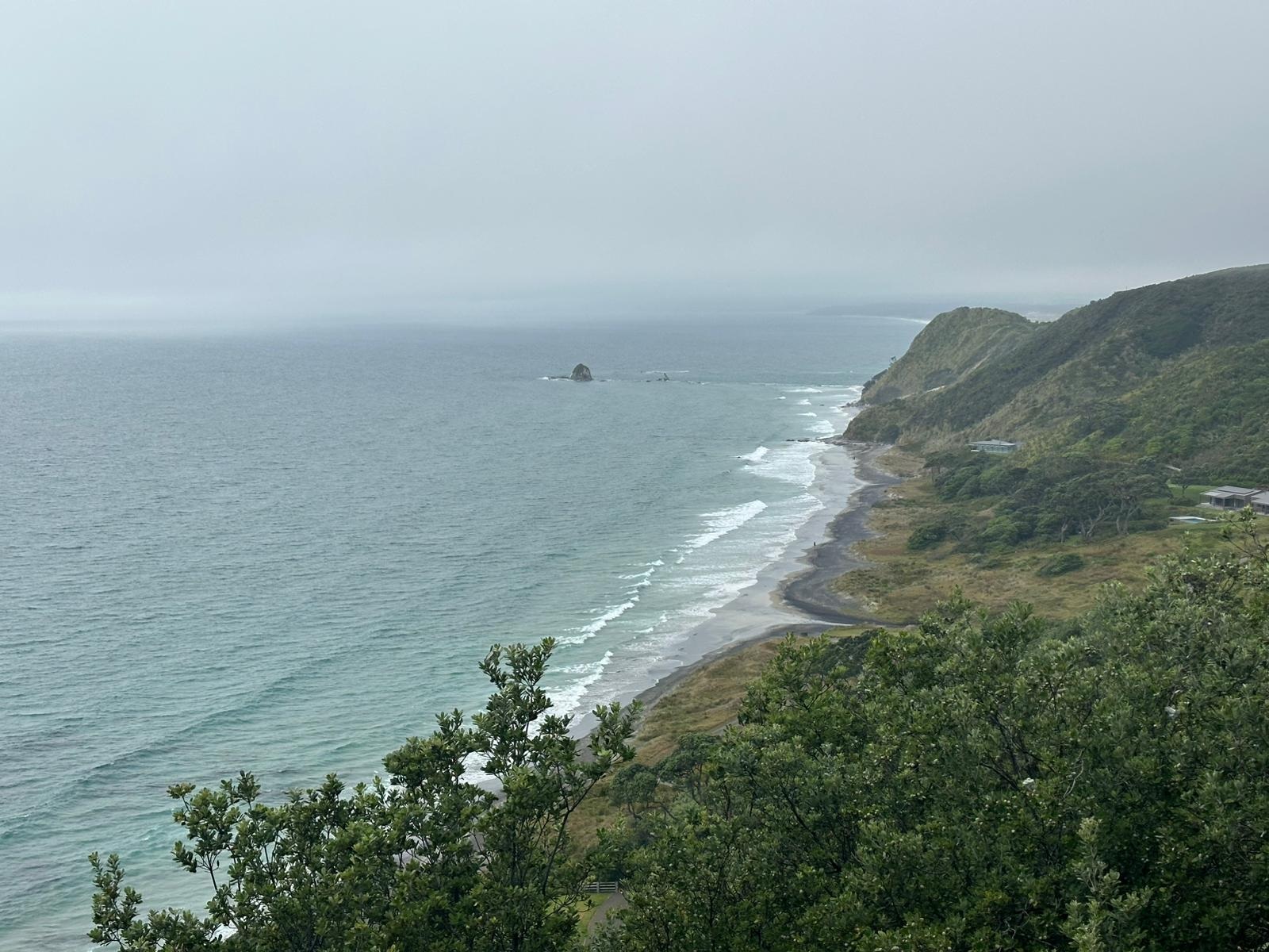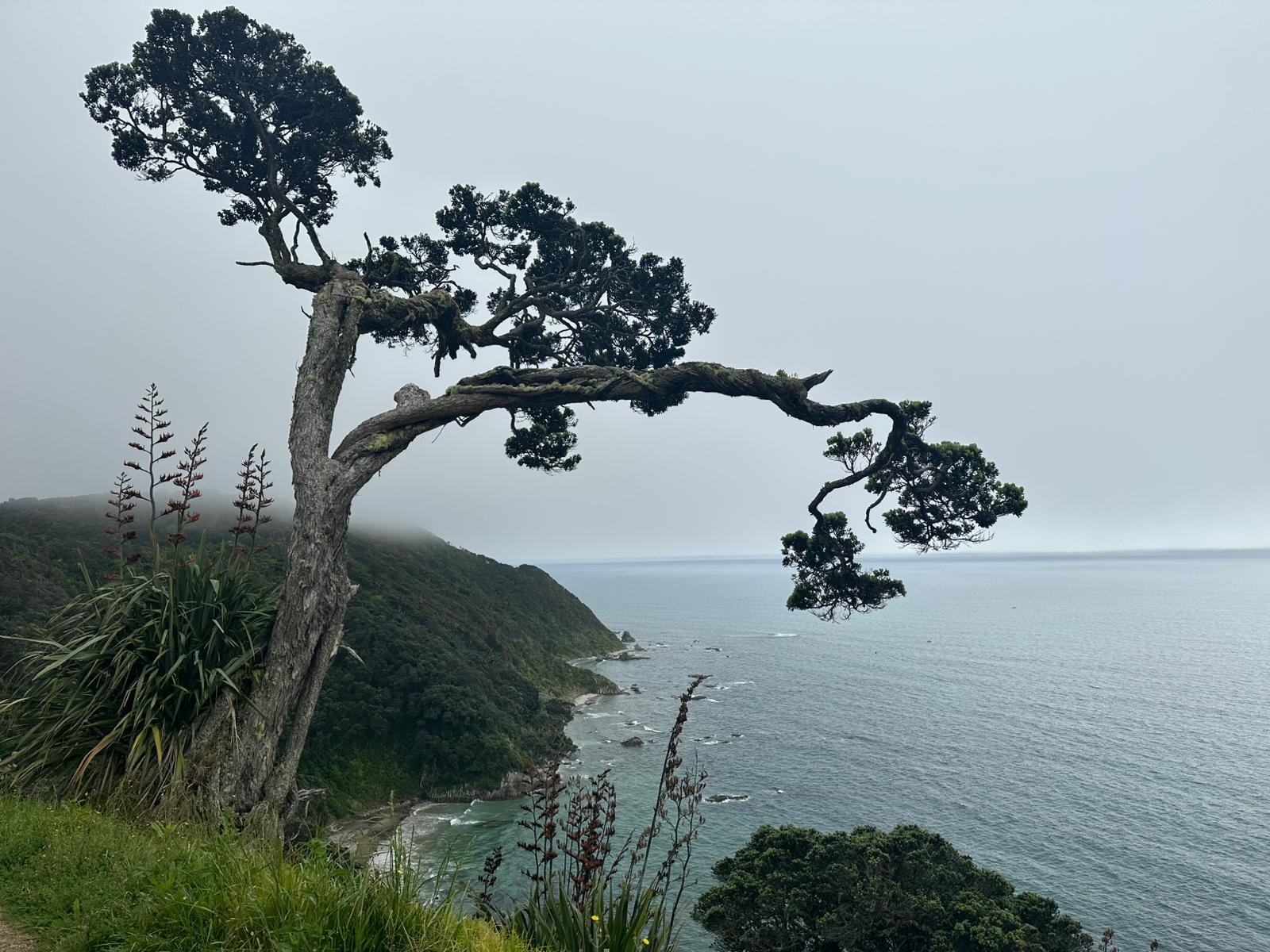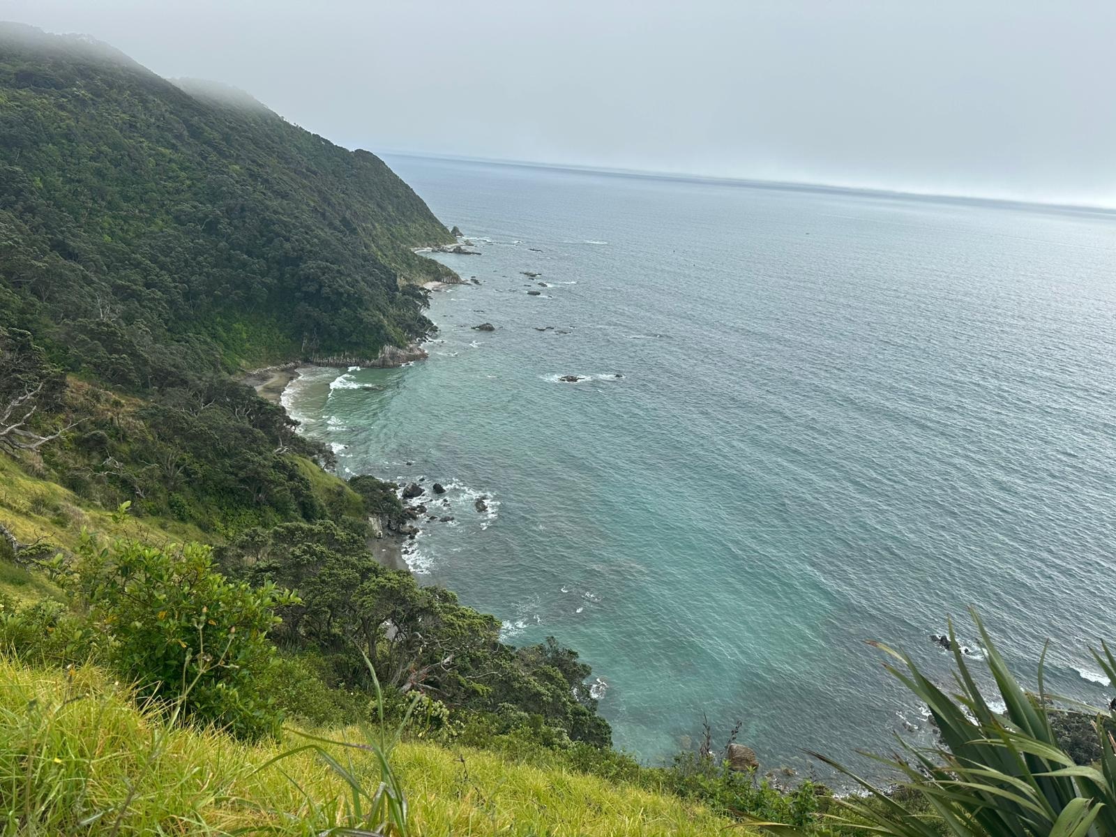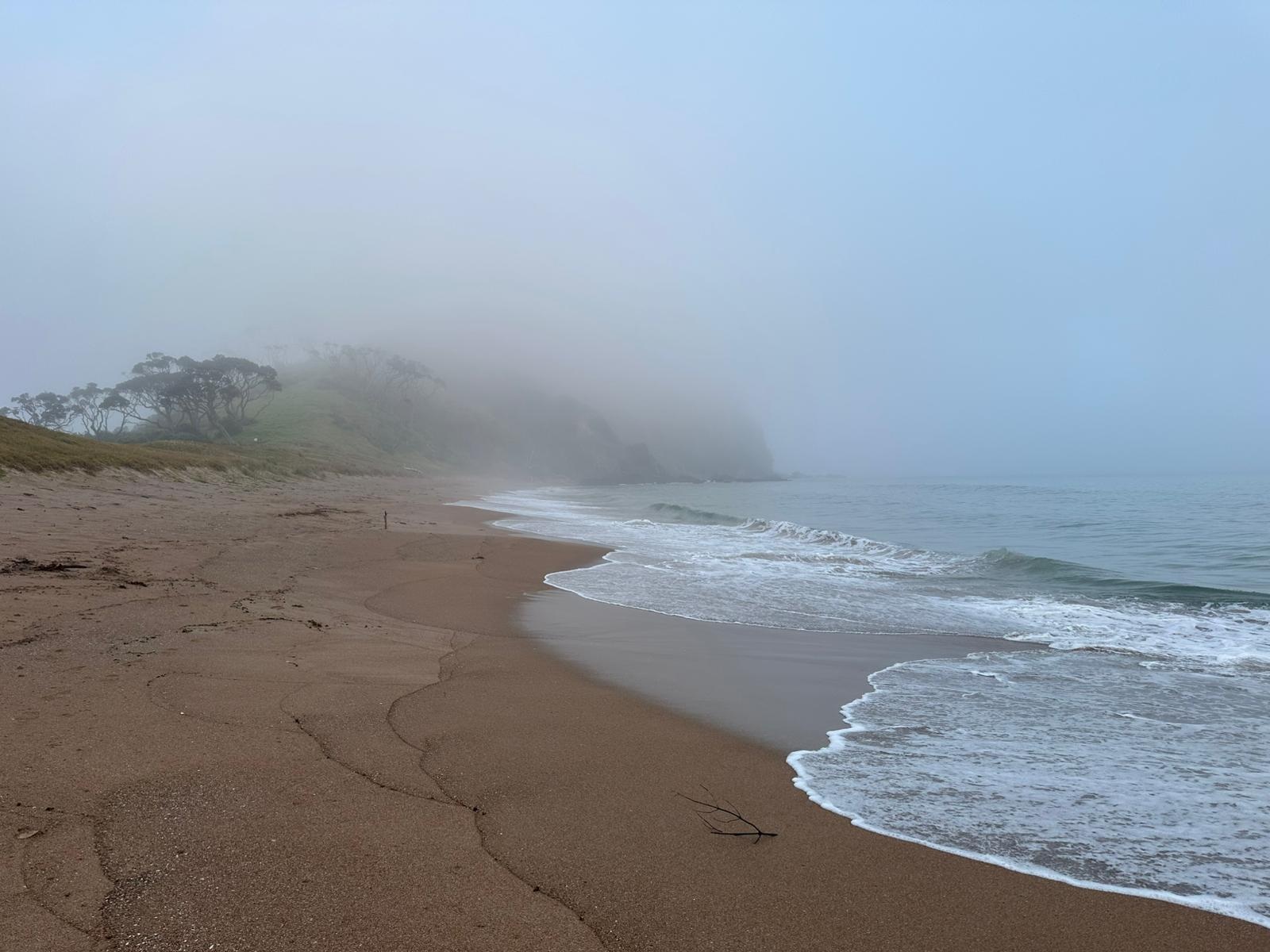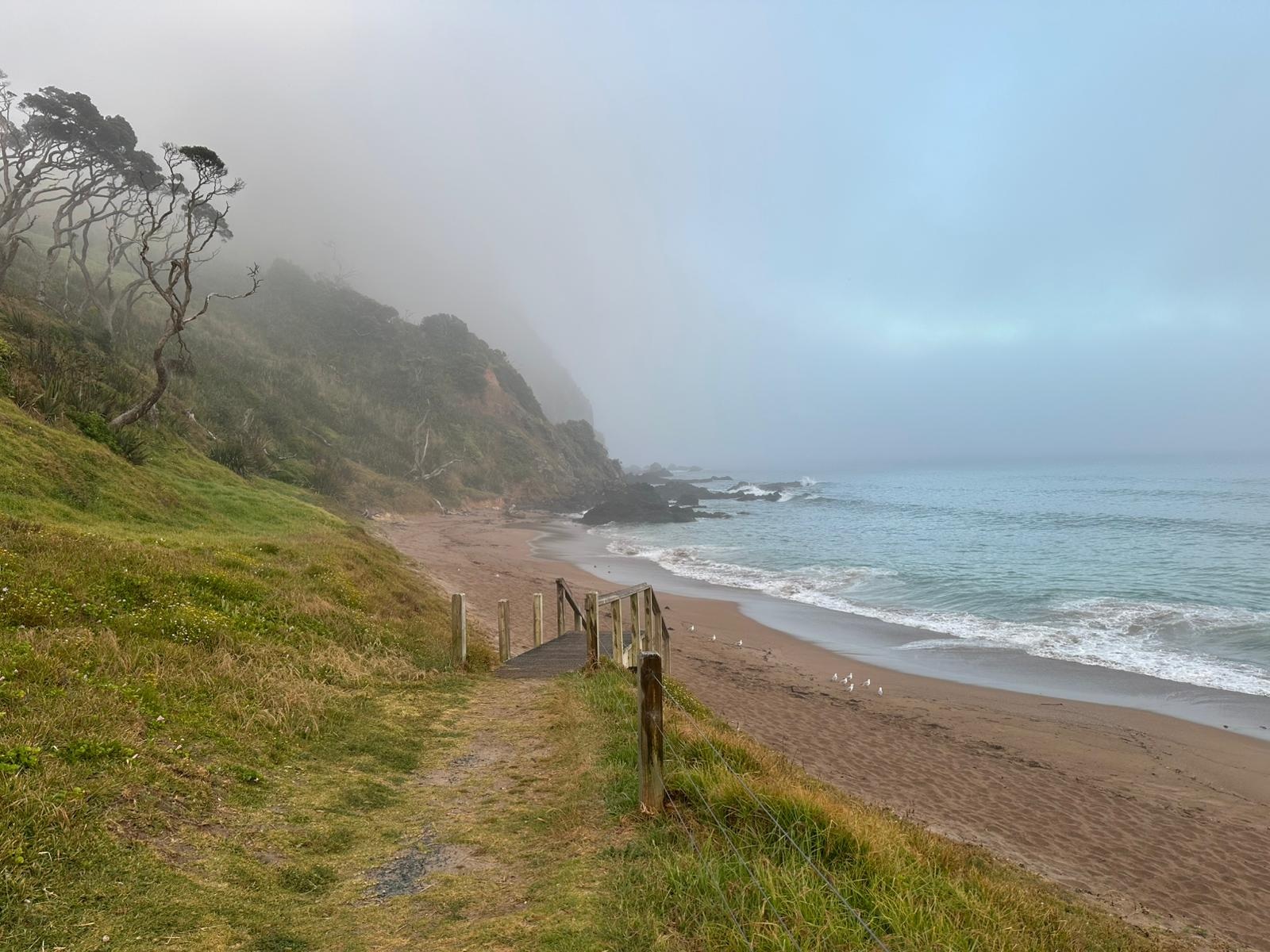 Schon bald befand ich mich auf dem Mangawhai Cliffs Walk, einem Küstenpfad, der mir immer wieder Blicke auf das Meer freigab, wenn die Bäume es zuließen. Der Nebel hatte sich noch nicht komplett verzogen, und die Sonne musste sich erst durchkämpfen.