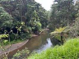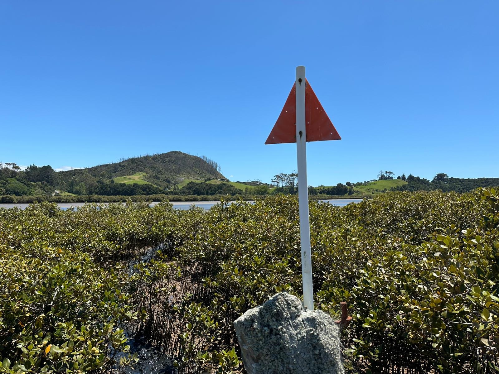Nachdem ich den letzten Fluss für diesen Tag durchwatet hatte, lagen noch gut fünf Kilometer bis zur Campsite vor mir. Daraufhin stand ein Anstieg von knapp 400 Höhenmetern auf den letzten zwei Kilometern bevor. Lieber wollte ich heute noch etwas weiterkommen, denn ich wusste, dass auch der morgige Tag anstrengend werden würde. Um mich für die letzten Kilometer zu motivieren, gönnte ich mir an der letzten Möglichkeit ein Eis und eine neuseeländische Limo. Das "kleine Stückchen" würde ich jetzt spielend schaffen! Der eben überquerte Fluss verlief nun zu meiner Rechten, gesäumt von Mangroven. Die Berge hatten derweil schon wieder eine Wolke als Mützchen aufgesetzt.