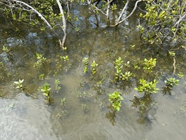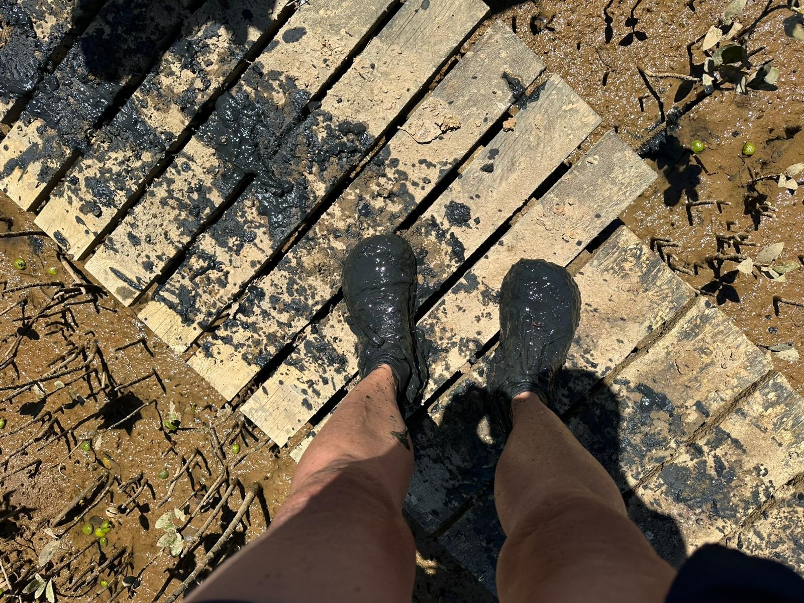 Wir mussten tatsächlich bis 12:30 Uhr ausharren, bevor wir weiterziehen konnten. Das Wasser war einfach zu hartnäckig. Endlich ging es los, am Strand entlang und dann hinein in den Mangrovenmatsch. Zuerst war das Wasser nur knöcheltief. Leider habe ich keinen einzigen Rochen gesehen – schade! Das letzte Stück ging es dann durchs Wasser, das mir aber nur bis leicht übers Knie reichte. Meine Hose blieb trocken!