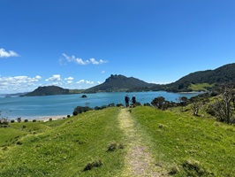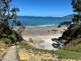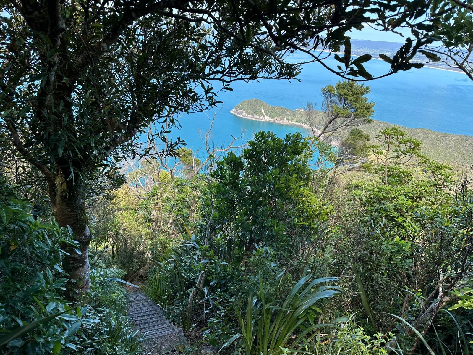 Dann ging es auf den Helena Ridge Track. Zuerst schlängelte sich der schmale Pfad durch den Wald, über all die Wurzeln, die den Weg so uneben machen. Und dann begannen die Stufen. Unzählige angelegte Stufen führten steil hinauf – Schutz der Landschaft vor Erosion und Hilfe für die Wanderer im ansonsten rutschig-gefährlichen Steilgelände. Immerhin gab es zwischendurch immer wieder einen tollen Ausblick auf das Meer. Der Pfad, von Gras gesäumt, und die Stufen wollten nicht aufhören. Es fühlte sich an, als würde es endlos bergauf gehen.