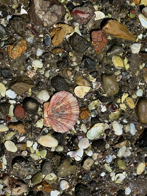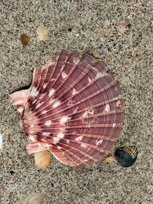 Obwohl die Flut immer noch weit in den Sand reichte, war das Laufen hier ein Traum. Überall lagen Jakobsmuscheln herum – so viele, wie ich sie noch nie zuvor gesehen hatte! Am liebsten hätte ich sie gleich säckeweise gesammelt, um mein Muschelglas zu Hause zu füllen. Es war faszinierend, die vielen Muscheln und unsere Spuren im feuchten Sand zu sehen. Der Himmel über dem Meer zeigte sich azurblau mit leichten Schleierwolken, doch der Blick nach rechts über die Dünen offenbarte dicke, graue Wolken. Ich zog es vor, nach links zu schauen und das schöne Blau zu genießen.