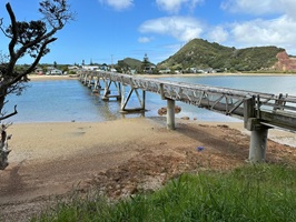 Das Städtchen Mangawhai selbst war nichts Besonderes. Ich war schnell hindurch und auf der Brücke. Mir fiel nicht sofort auf, dass Muschelbruchstücke in den Gehweg eingearbeitet waren – sehr originell.