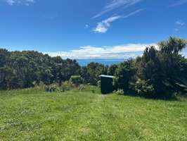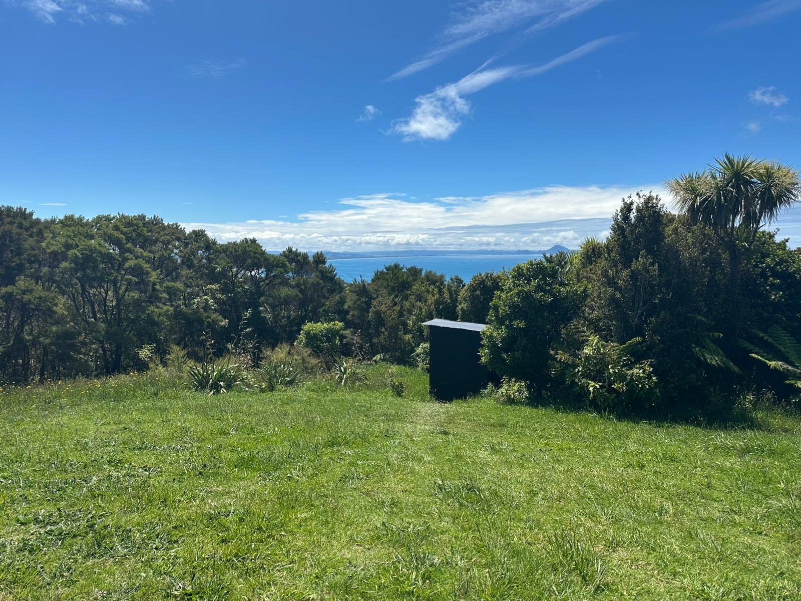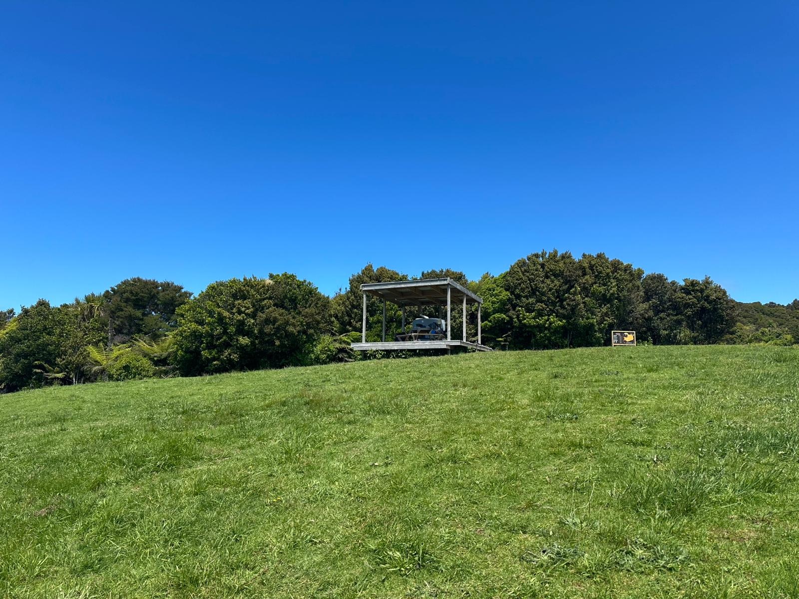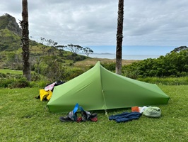 Aber die Mühe hat sich gelohnt! Schon um 14:30 Uhr waren wir im Waorahi Camp. Es ist traumhaft gelegen: eine riesige, gewölbte Wiese mit Blick auf die Küste. Es gibt sogar eine überdachte Holzterrasse mit Sitzgelegenheiten. Wasser und Toilette sind vorhanden – mehr brauche ich nicht.