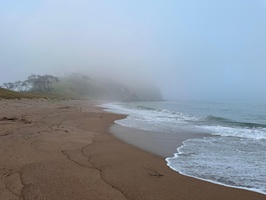 Wieder einmal eine kurze Nacht – es will mir nicht gelingen,den Tiefschlaf in die zweite Hälfte der Nacht hinüber zu retten. Aber das wird noch! Auch hatte das stetige Rauschen des Meeres eine angenehm beruhigende Wirkung. Als ich morgens aus dem Zelt schlüpfte, lag noch ein dichter Nebel über der Küste. Das ich dennoch den Weg hinunter zum Strand fand, wurde mit einem herrlich mystischen Moment belohnt, als der Nebel an der Steilküste langsam aufstieg und dem morgendlichen Sonnenlicht Platz machte.