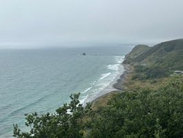 Da oben, auf dieser Umgehung der felsigen Küste, überraschte mich ein kräftiger Schauer. Ich konnte gerade noch meinen Poncho überziehen. Es ging dann durch ein kleines Wäldchen und über ein kurzes Stück Straße schnell wieder zurück zum Strand. Zum Glück hörte der Regen nur kurze Zeit später wieder auf. Es blieb bei einer heftige, aber kurze Dusche. Der Poncho war schnell getrocknet, konnte verstaut werden, und weiter ging es am nächsten Strand netlang, den wolkenverhangenen Bergen entgegen.