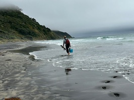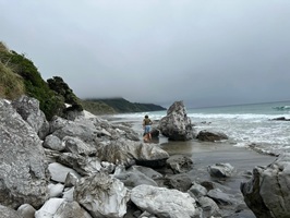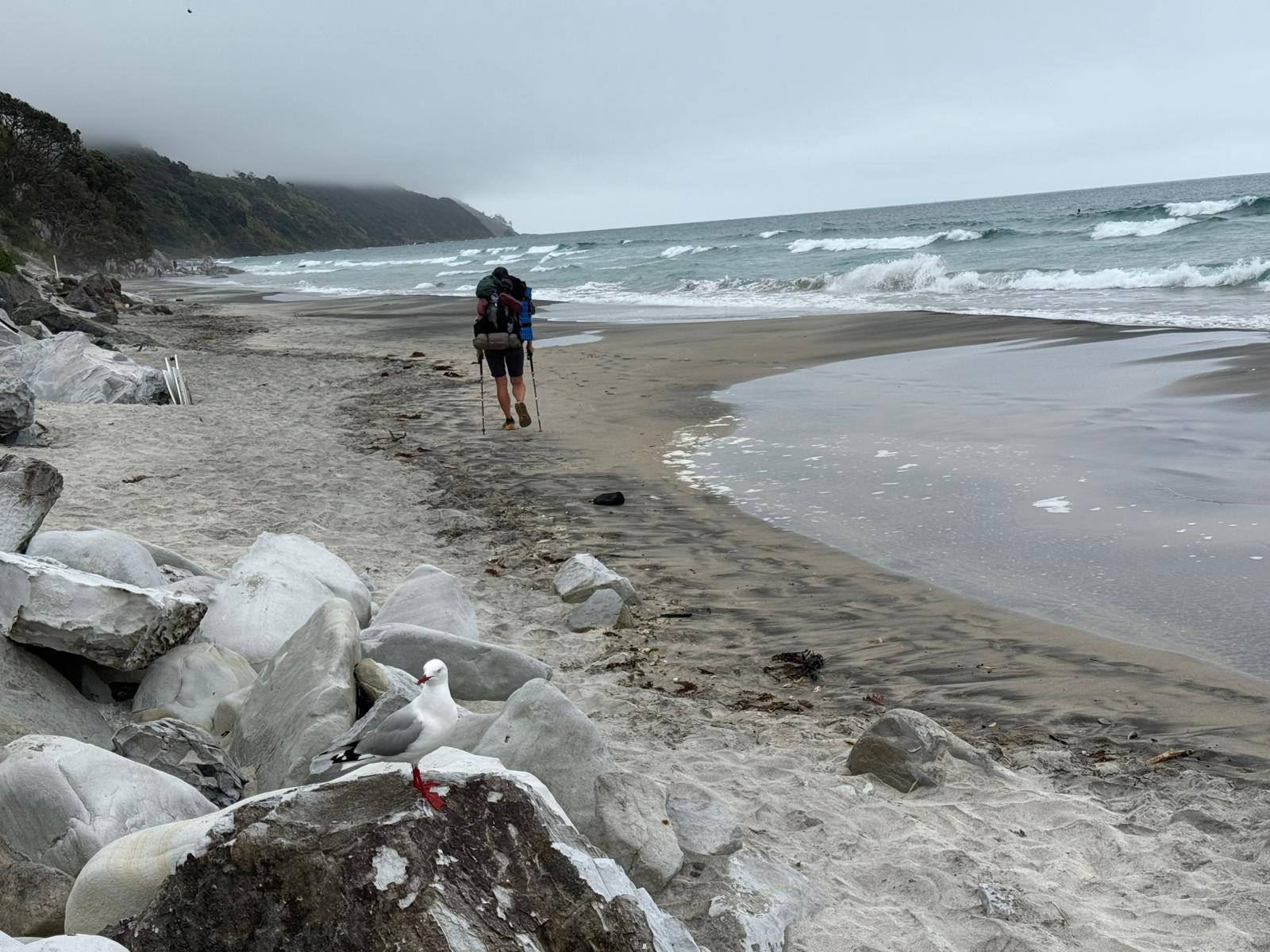 Der nächste Abschnitt führte mich dann einige Kilometer über den Strand – schwarzer Sand und Muscheln, genau das Richtige für mich. Hier ein Schwätzchen mit einem Hundebesitzer, dort mit einem Angler, und auch Anwohner traf ich reichlich. Diese vielen kleinen Unterhaltungen gehören zu meinem Alltag hier. Die Neuseeländer sind so freundlich, unglaublich sympathisch und offen, das gefällt mir sehr. Bevor ich den Strand verlassen musste, gab es noch einen kleinen Snack zu Mittag direkt am Wasser. Die Möwen sammelten sich gierig um mich, aber für sie gab es nichts ab.