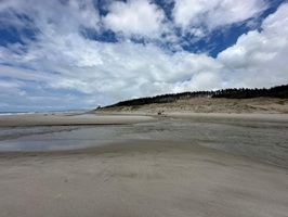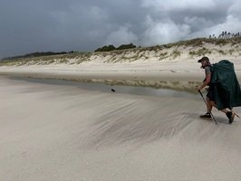 Als ich in einen Kiefernwald eintauchte, erhaschte ich schon von Weitem einen ersten Blick auf das Meer. Kurz darauf traf ich auf die anderen Wanderer unserer Gruppe, die gestern eine beachtliche Strecke von 36 Kilometern zurückgelegt hatten, um wieder aufzuschließen. Schwupps, und schon standen wir wieder am Strand, der, wie so oft auf diesem Trail, einfach einmalig war. Das Wasser reichte noch ziemlich hoch und meine Füße wurden schnell nass – aber das war ich ja inzwischen gewohnt und es machte mir absolut nichts mehr aus. Ein schöner Anblick waren die Seevögel, die sich auf einer Sandbank in der Sonne räkelten.