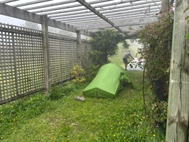 Nass geschwitzt und dem Wind ausgesetzt, war es bei der Ankunft etwas unangenehm. Wie gut, dass ich eine Regenhose dabeihatte! Aber ich war heil angekommen. Schnell hatte ich das Zelt unter einer schützenden Pergola aufgebaut, gekocht und gegessen. Das Wetter blieb ungemütlich, windig und kühl. Nach dem Essen und dem Sortieren meiner Ausrüstung war ich froh, in meinem warmen Schlafsack zu liegen.