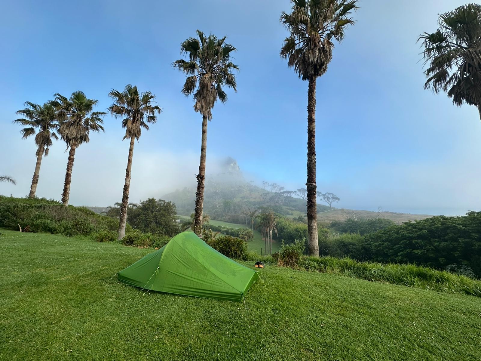 Das Schild für das letzte Stück wies auf 2,5 Kilometer und 45 bis 60 Minuten Gehzeit hin! Oh Mann, diese letzte Etappe hatte es wirklich in sich! Ich lief direkt in den Nebel hinein, der immer dichter wurde, je höher ich stieg. Ich dachte, es käme kein Ende mehr. Nur das Meer sah ich als schmalen blauen Streifen in der Ferne. Schweißgebadet erreichte ich endlich den höchsten Punkt und war froh, an der Campsite anzukommen – wieso muß die auch so hoch oben liegen?!