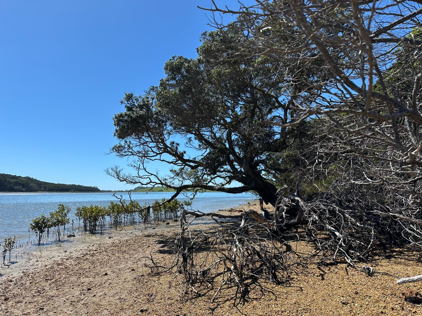 Der Kampf durch die Mangroven war eine eigene Herausforderung. Obenauf ist der Schlamm gräulich-bräunlich, aber sobald man hineintrat, wurde er tiefschwarz – und Fäulnisgeruch machte sich breit. Als wir auf der anderen Seite ankamen, erwartete uns Ken, der Neuseeländer, mit Süßigkeiten. Ein willkommener Zuckerschub für den steilen Anstieg, der uns bevorstand! Meine Schuhe waren schwarze Klumpen an meinen Füßen, unglaublich schwer, als wir die Wiese hinaufstapften. Beim steilen Anstieg waren sie noch schwerer, ganz zu schweigen von dem Gestank!