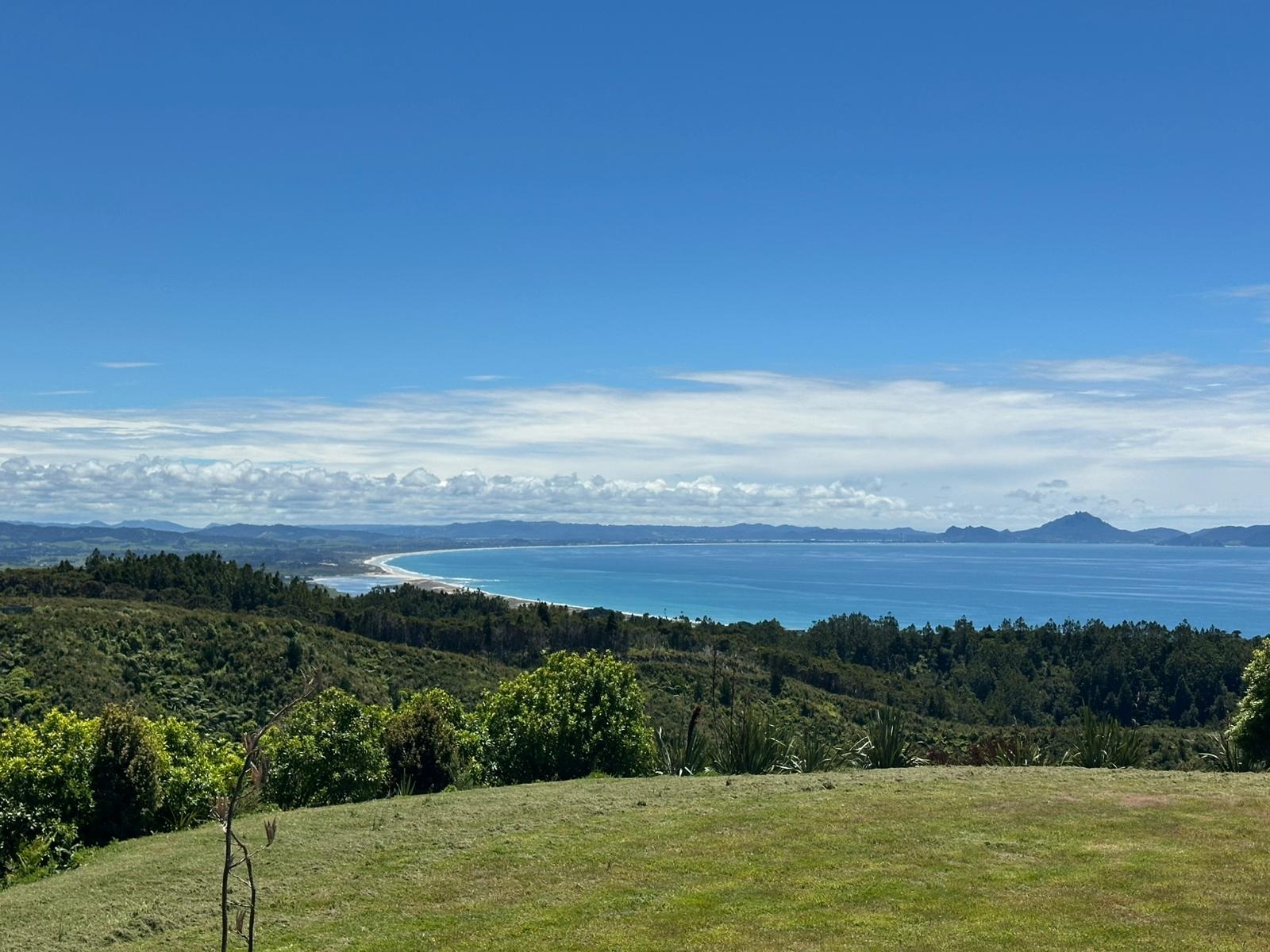 Die Sonne scheint noch, und ich bin gespannt auf den Sonnenuntergang. Eben konnte ich noch die Berge auf der anderen Seite sehen, aber jetzt verschwinden sie langsam in einer langen, weißen Wolke... Aotearoa – Land der langen, weißen Wolke - halt. Es ist phänomenal, wie sich die Wolke über die Bucht schiebt.