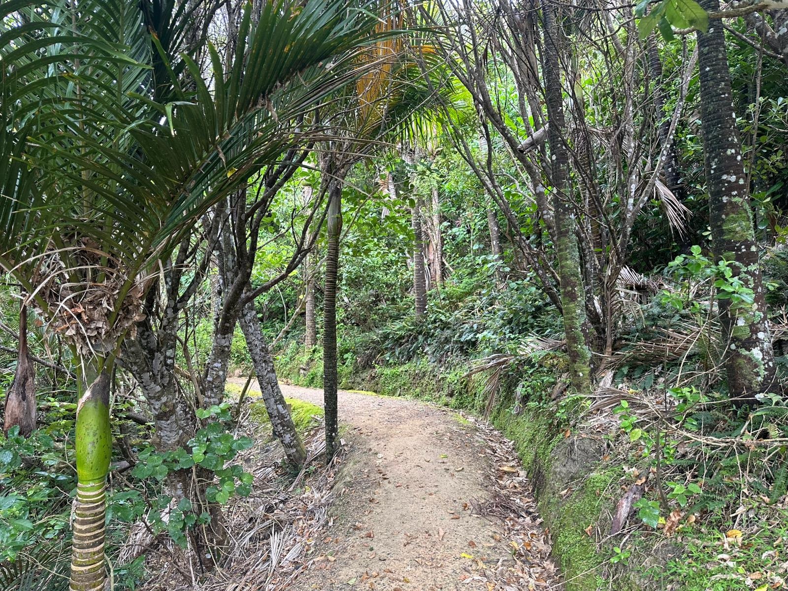 Kurz darauf lief ich auf einem schmalen, befestigten Schotterweg durch einen kleinen Wald, während der Nieselregen langsam aufhörte. Es ist unglaublich, dieser Wechsel: Eben noch auf der Weide, und jetzt war ich plötzlich von Palmen und Lianen umgeben – was für ein Wahnsinn.